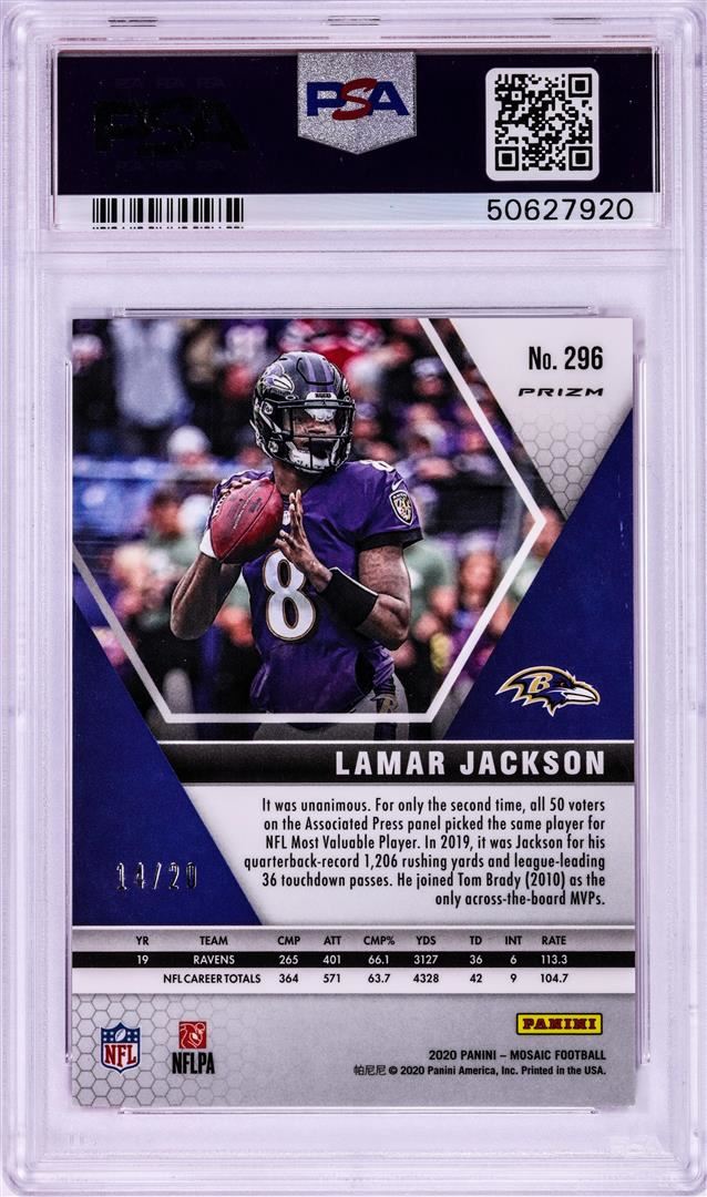 One 2020 Panini Mosaic No Huddle Pink Lamar Jackson NFL Card #296 - 14/20 PSA Gem Mint 10. PSA Certified.