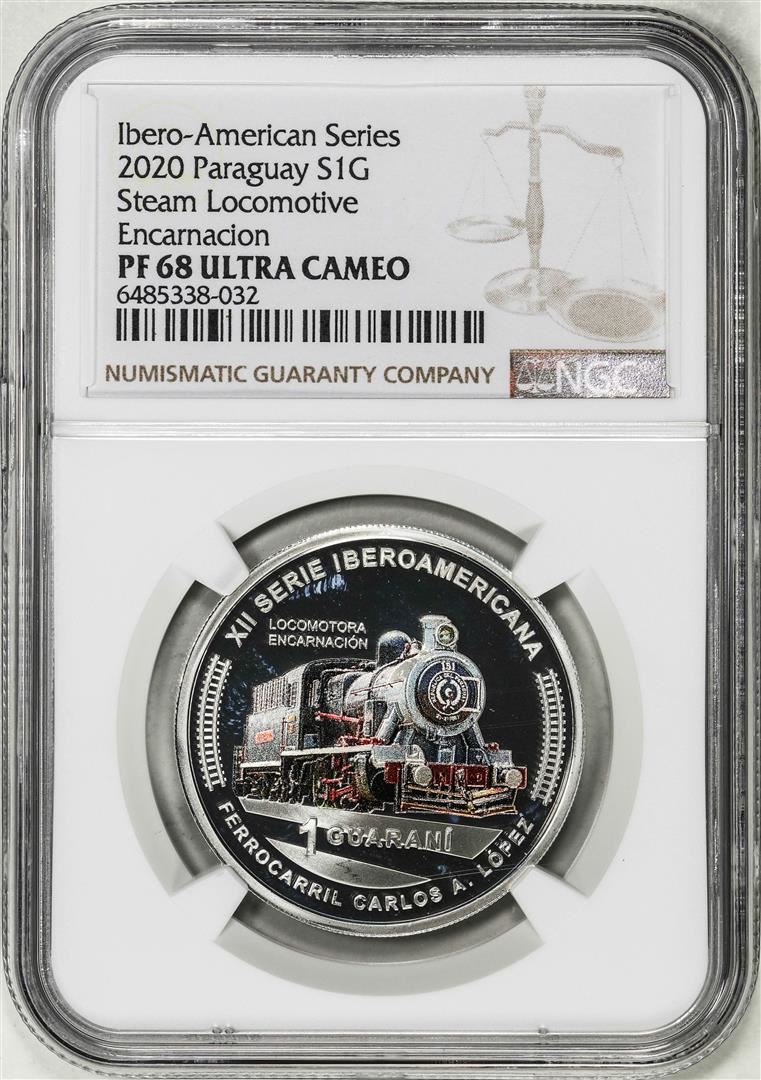 One 2020 Paraguay 1 Guarani Steam Locomotive Trains Silver Coin NGC PF68 Ultra Cameo. NGC Certified.