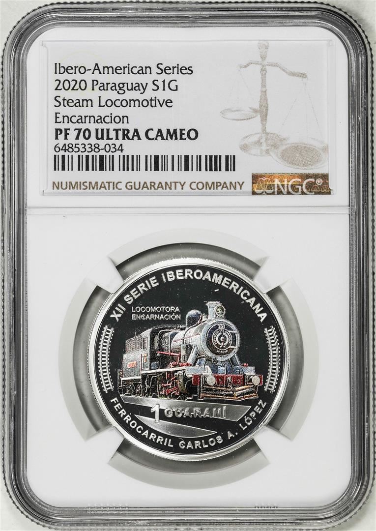 One 2020 Paraguay 1 Guarani Steam Locomotive Trains Silver Coin NGC PF70 Ultra Cameo. NGC Certified.