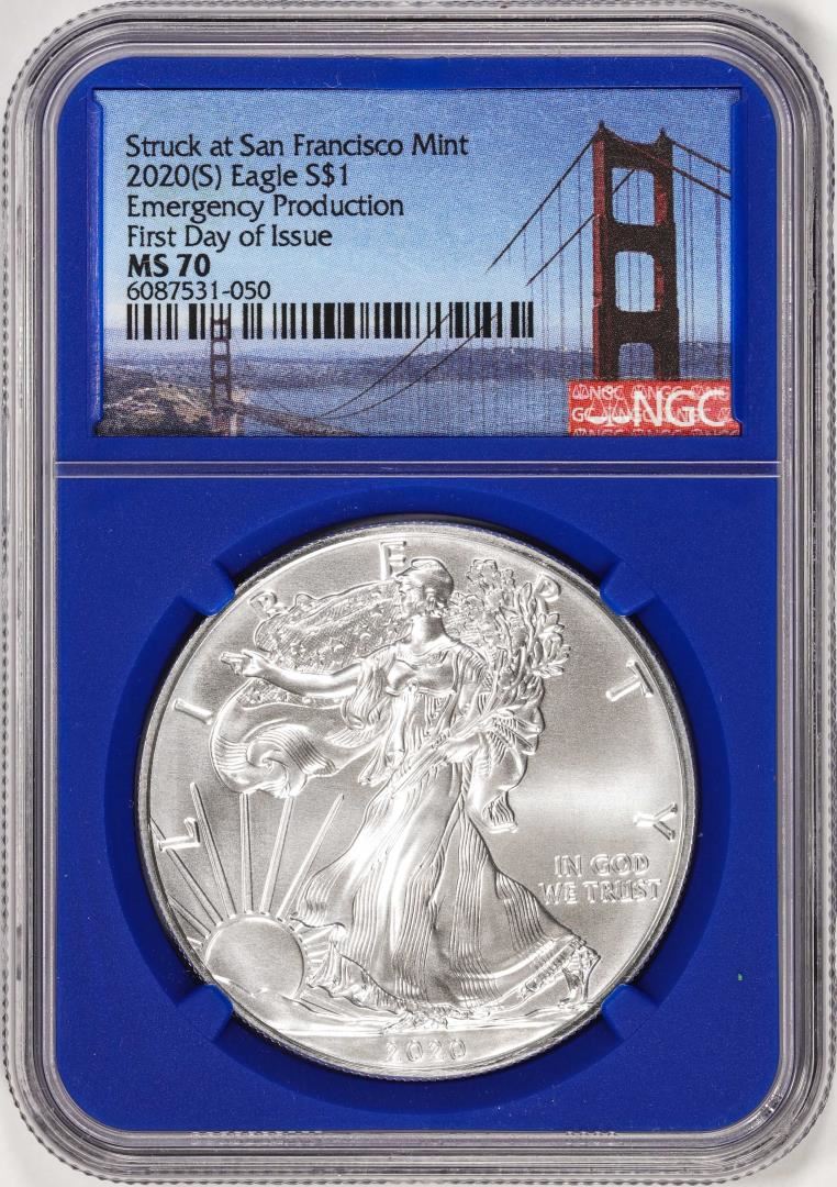 2020(S) $1 American Silver Eagle Coin NGC MS70 FDOI San Francisco Mint Blue Core