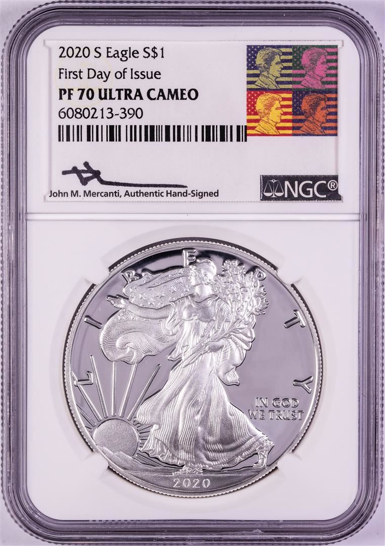 2020-S $1 Proof American Silver Eagle Coin NGC PF70 Ultra Cameo Mercanti Signature FDOI