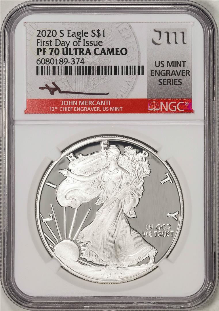 2020-S $1 Proof Silver Eagle Coin NGC PF70 Ultra Cameo Mercanti Signature FDOI
