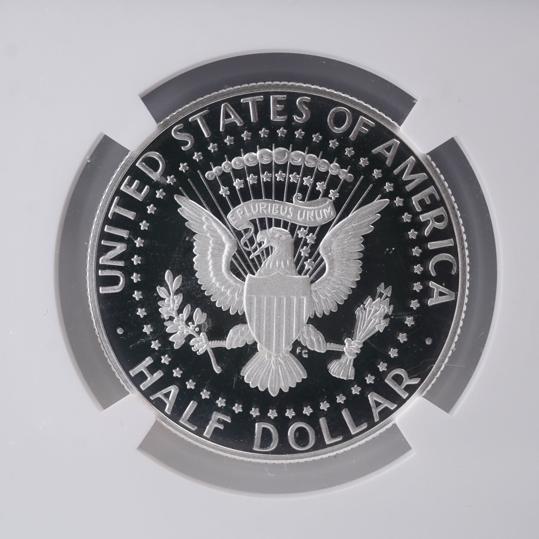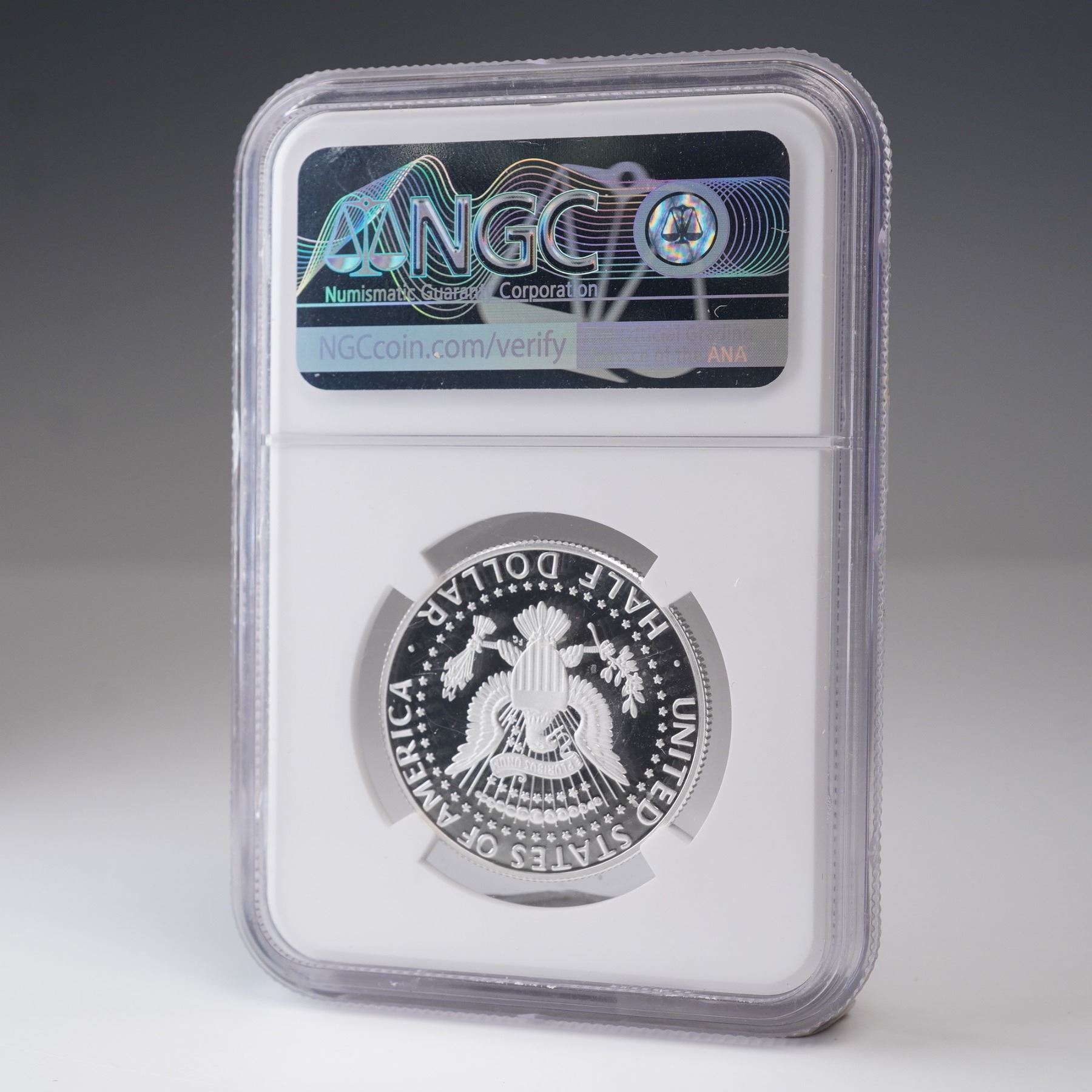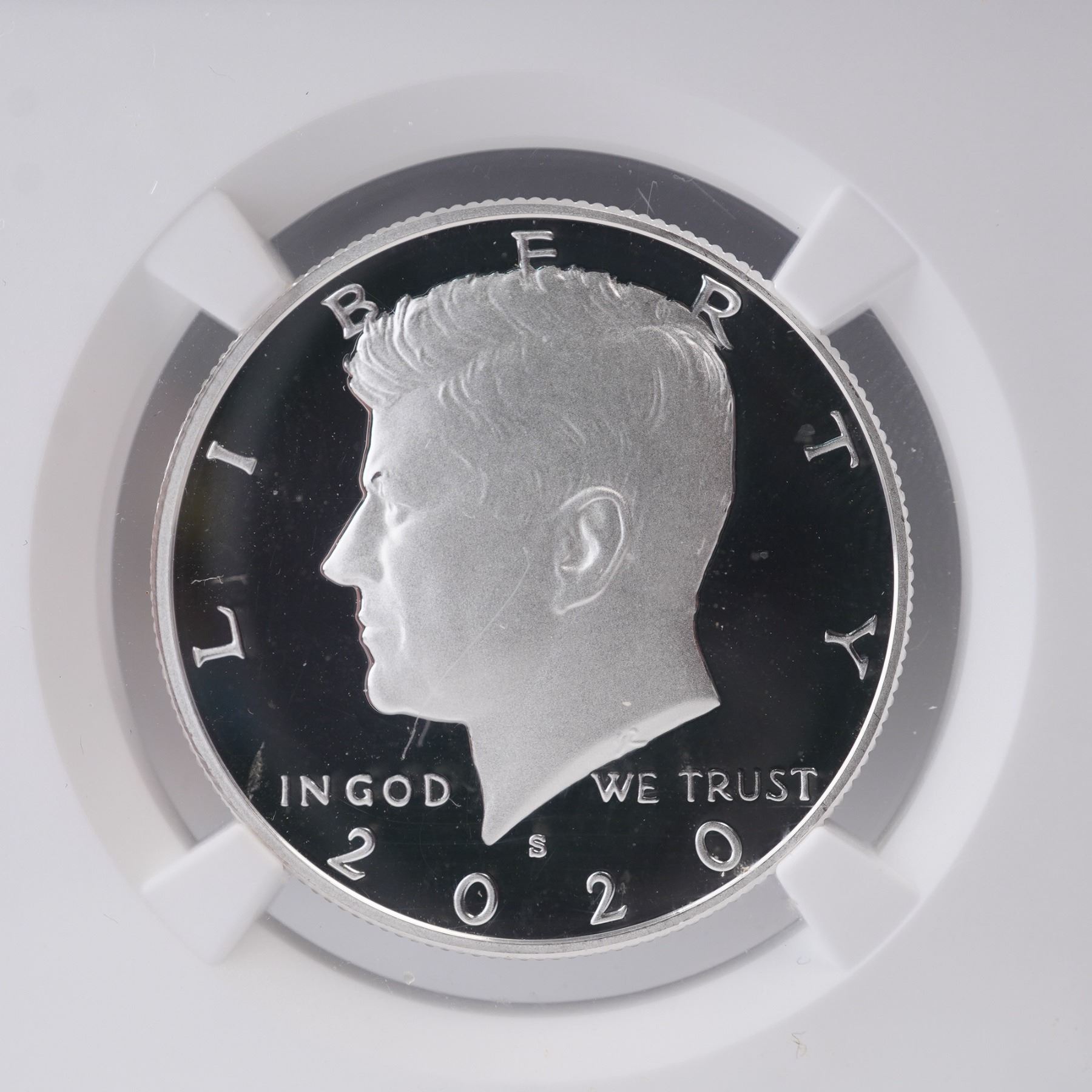 Struck in brilliant 99.9% silver at the San Francisco Mint. Silver proof strike, issued as part of the Official U.S. Mint 10-Coin Silver Proof Set and graded PF 69 Ultra Cameo by NGC. The obverse designs as the head of Kennedy, the "S" mint mark, further surrounded by LIBERTY, IN GOD WE TRUST, and the year 2020. The reverse depicts the presidential coat of arms with meticulous clarity; an eagle clutching olive branches and arrows beneath a ring of fifty stars. Housed in a graded NGC holder for further preservation and authentication. Slab measures: 2.25"L x 0.25"W x 3.25"H. Coin diameter: 30.61 mm.