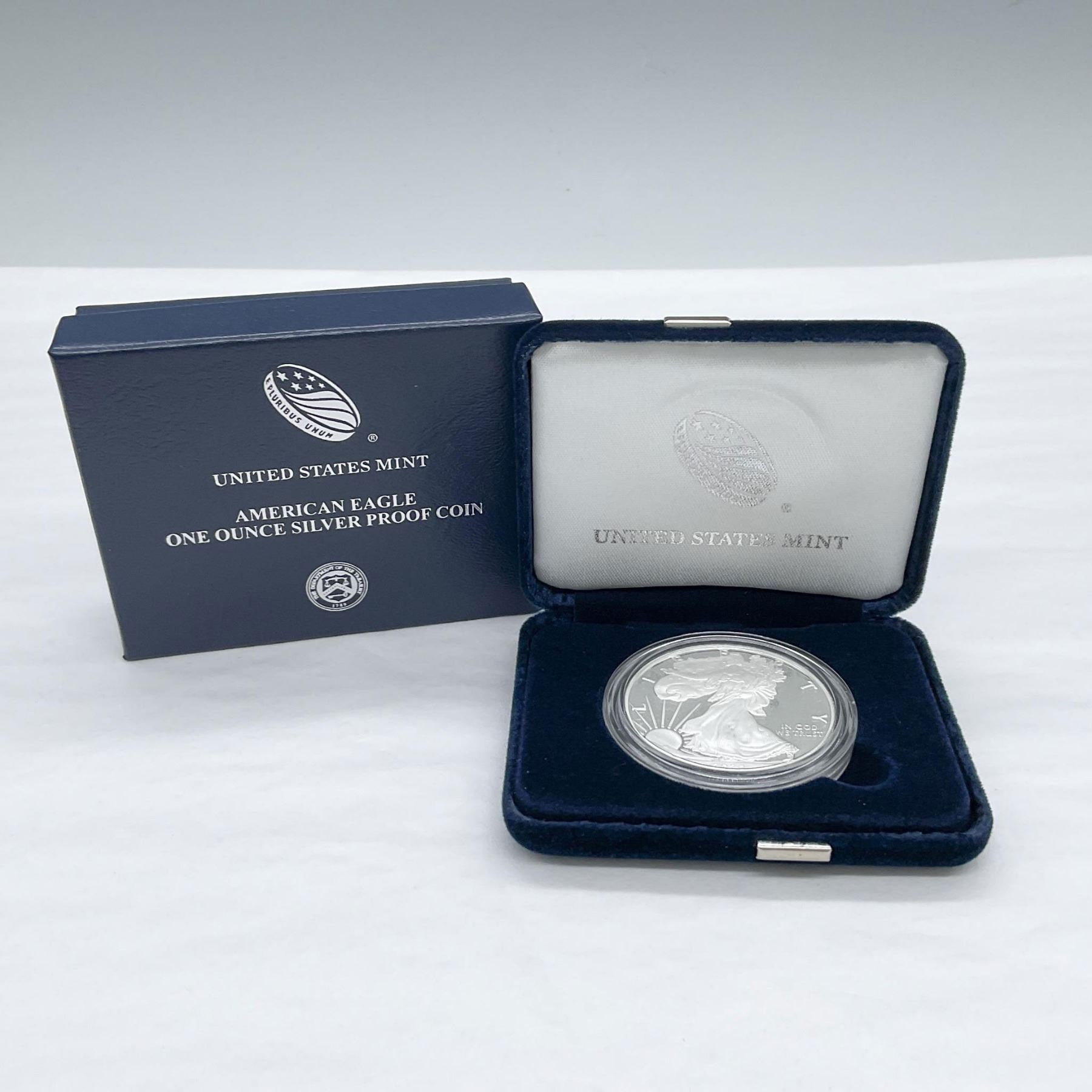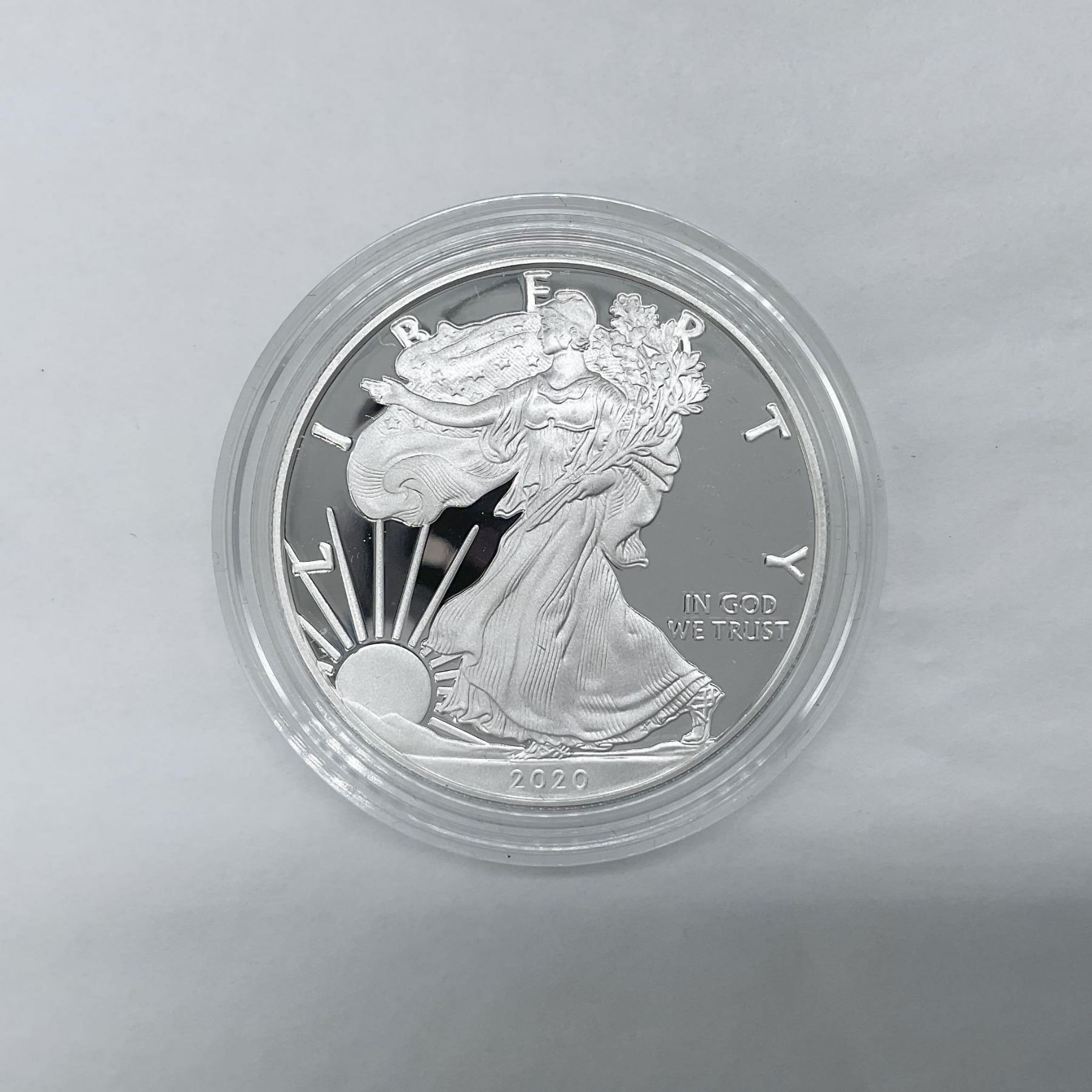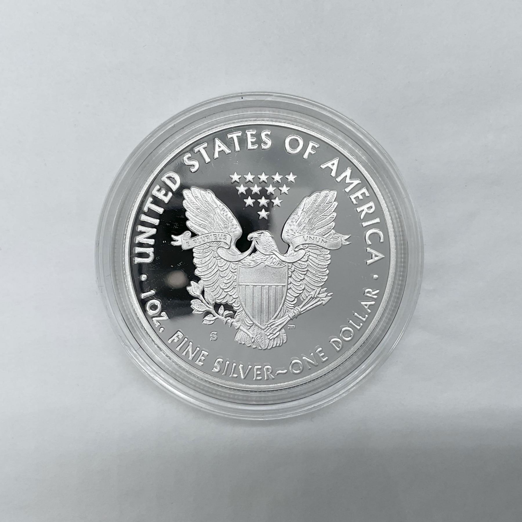 San Francisco Mint. The obverse side depicts Liberty in full stride. She is shown wrapped in the flag, her right hand is extended and her left arm is carrying laurel and oak branches. The reverse side features the heraldic eagle clutching an olive branch and arrows. The coin is in a protective case. The case is approximately: 0.25"D x 2" dia. This item has its original box: 3.5"L x 3"W x 1"H.
