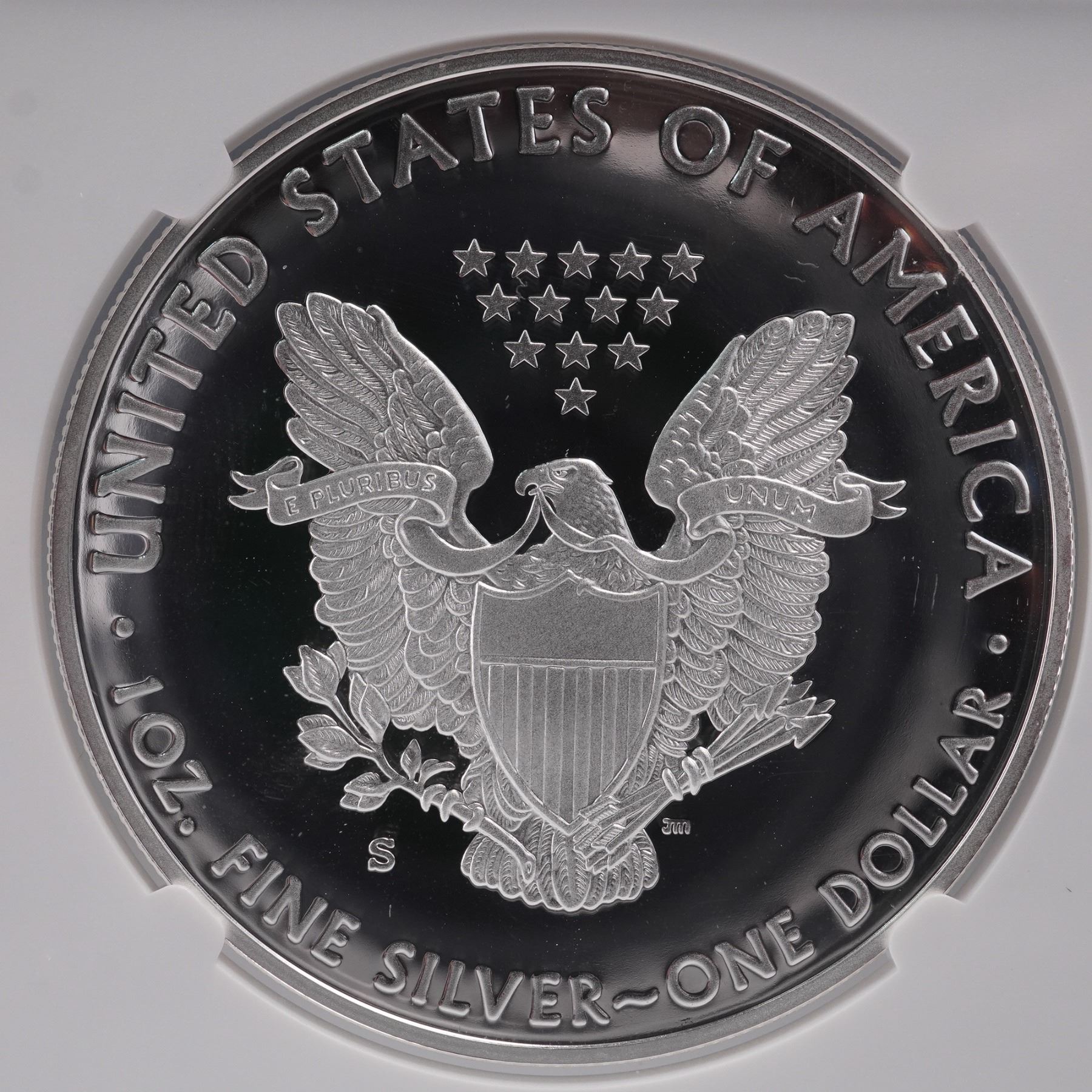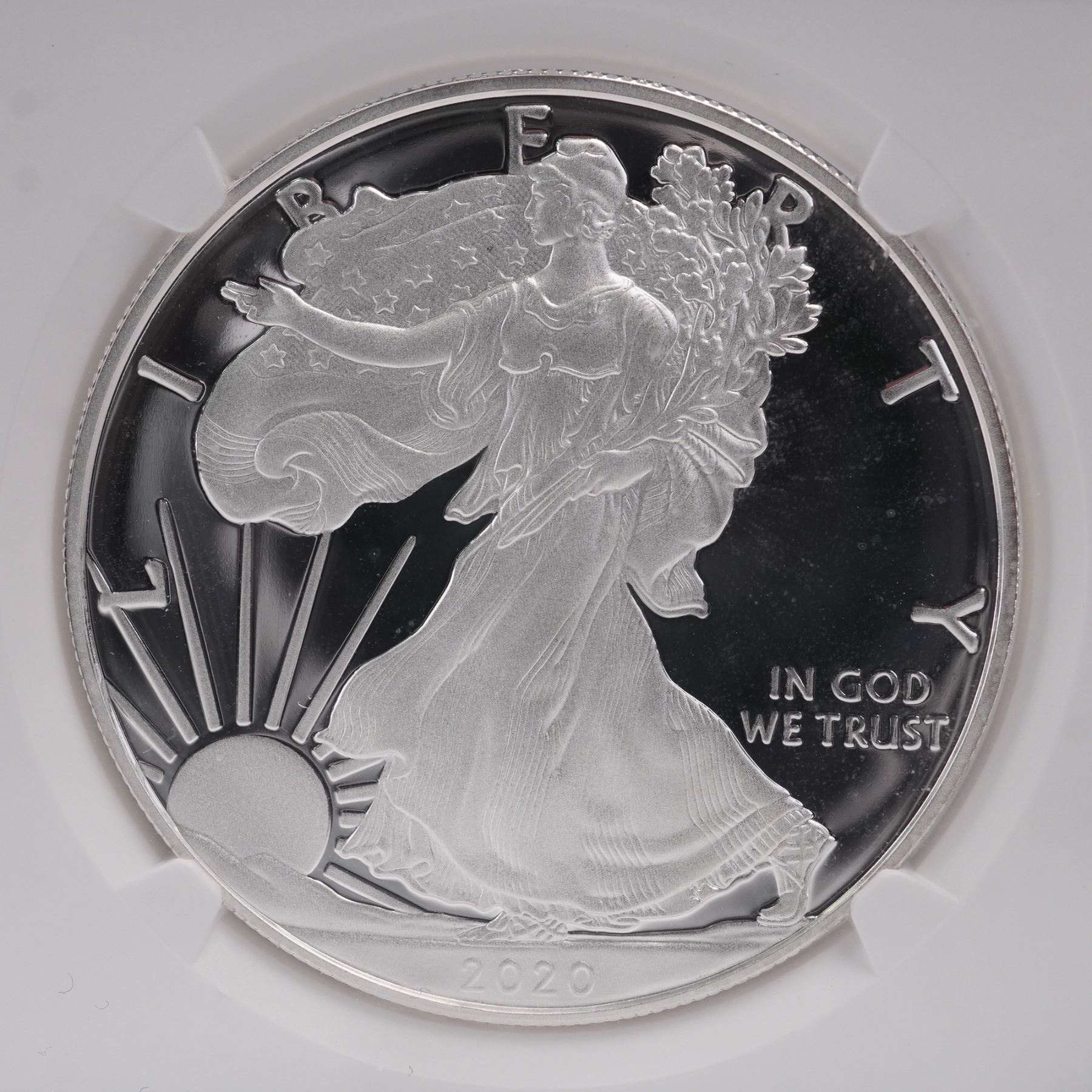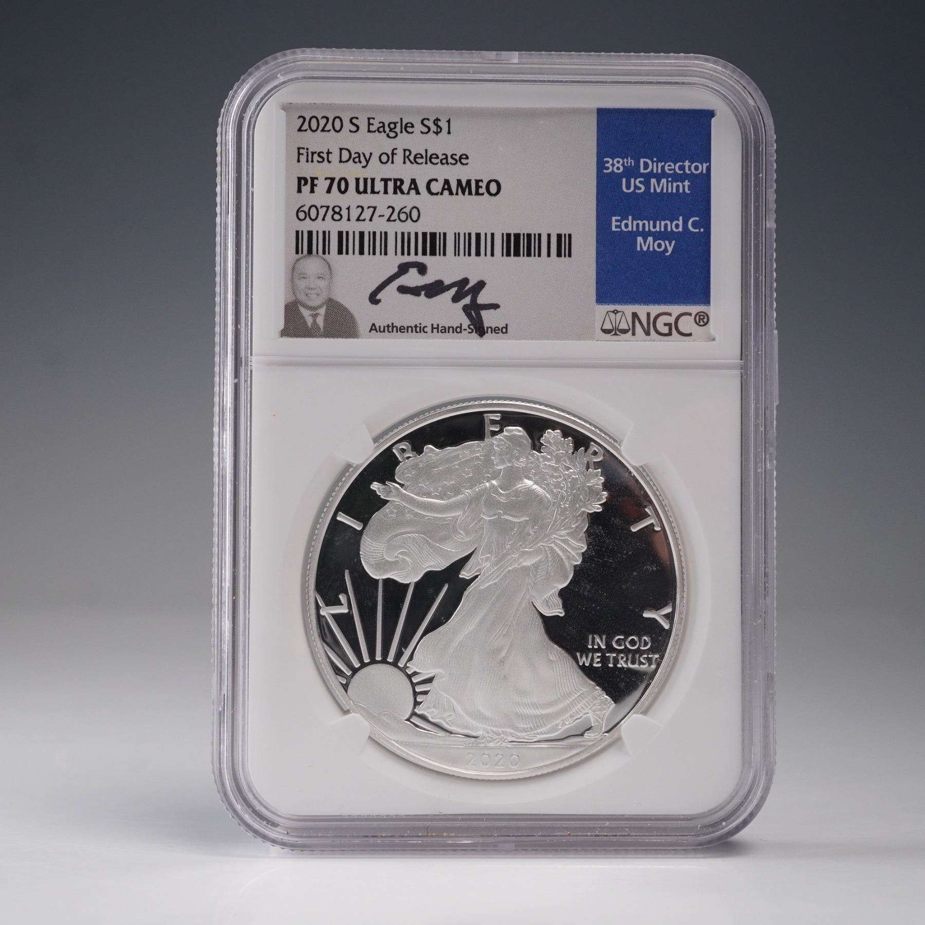 A 2020-S American Silver Eagle one-dollar coin struck in one troy ounce of .999 fine silver. The coin was minted at the San Francisco Mint, as indicated by the "S" mintmark on the reverse. It is encapsulated and certified by the Numismatic Guaranty Corporation (NGC) with a grade of PF 70 Ultra Cameo, denoting a flawless proof strike with deeply mirrored fields and frosted devices. This coin is designated as a "First Day of Release" issue and is presented in an official NGC slab, which includes a certification label hand-signed by Edmund C. Moy, the 38th Director of the United States Mint. The obverse features Adolph A. Weinman's classic "Walking Liberty" design, originally used on the half dollar from 1916 to 1947. Liberty is shown in full stride, draped in the folds of the American flag, with her right hand extended forward and branches of laurel and oak in her left arm. The reverse showcases the heraldic eagle with shield, designed by John Mercanti, featuring an eagle with outstretched wings clutching arrows and an olive branch, beneath thirteen stars representing the original colonies. The inscriptions on the reverse include "UNITED STATES OF AMERICA," "1 OZ. FINE SILVER~ONE DOLLAR," and "E PLURIBUS UNUM." This encapsulated coin represents both numismatic and bullion value and is a notable example from the final year of the original Silver Eagle reverse design series before its redesign in 2021. Slab: 2.25"L x 0.5"W x 3.25"H. Coin diameter: 39mm.