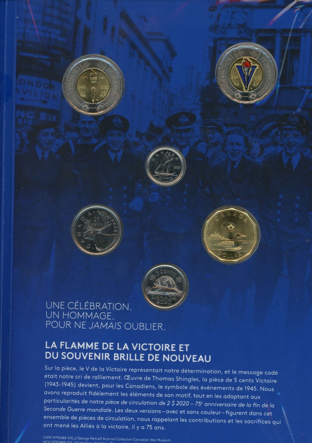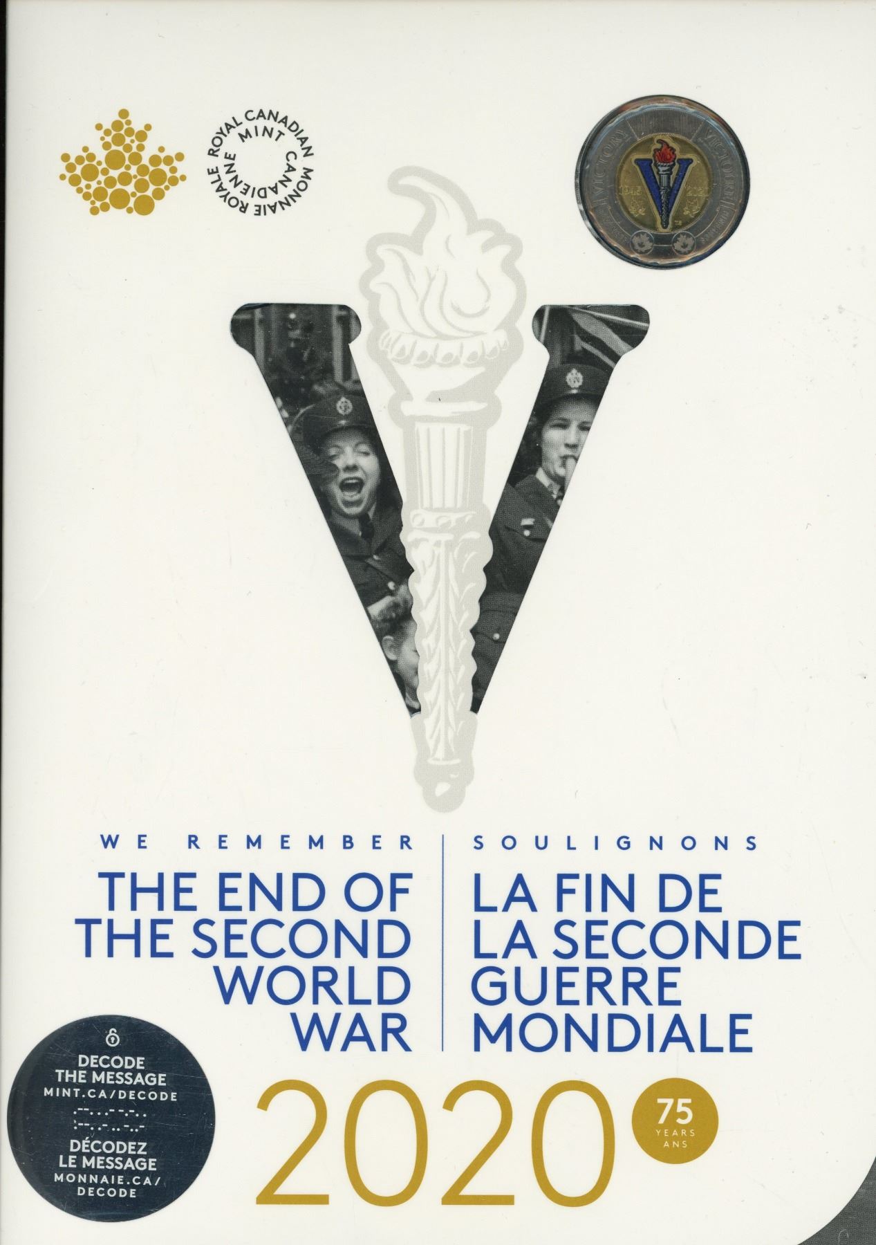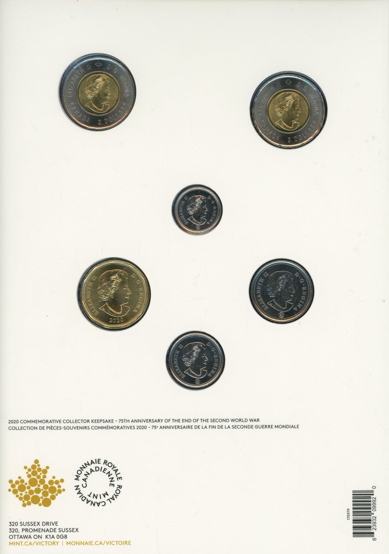 2020 The End of the Second World War 6-coin set. Includes 2 Toonies, one regular V For Victory, the other Colourized V For Victory. Housed in its original unopened Royal Canadian Mint packaging.