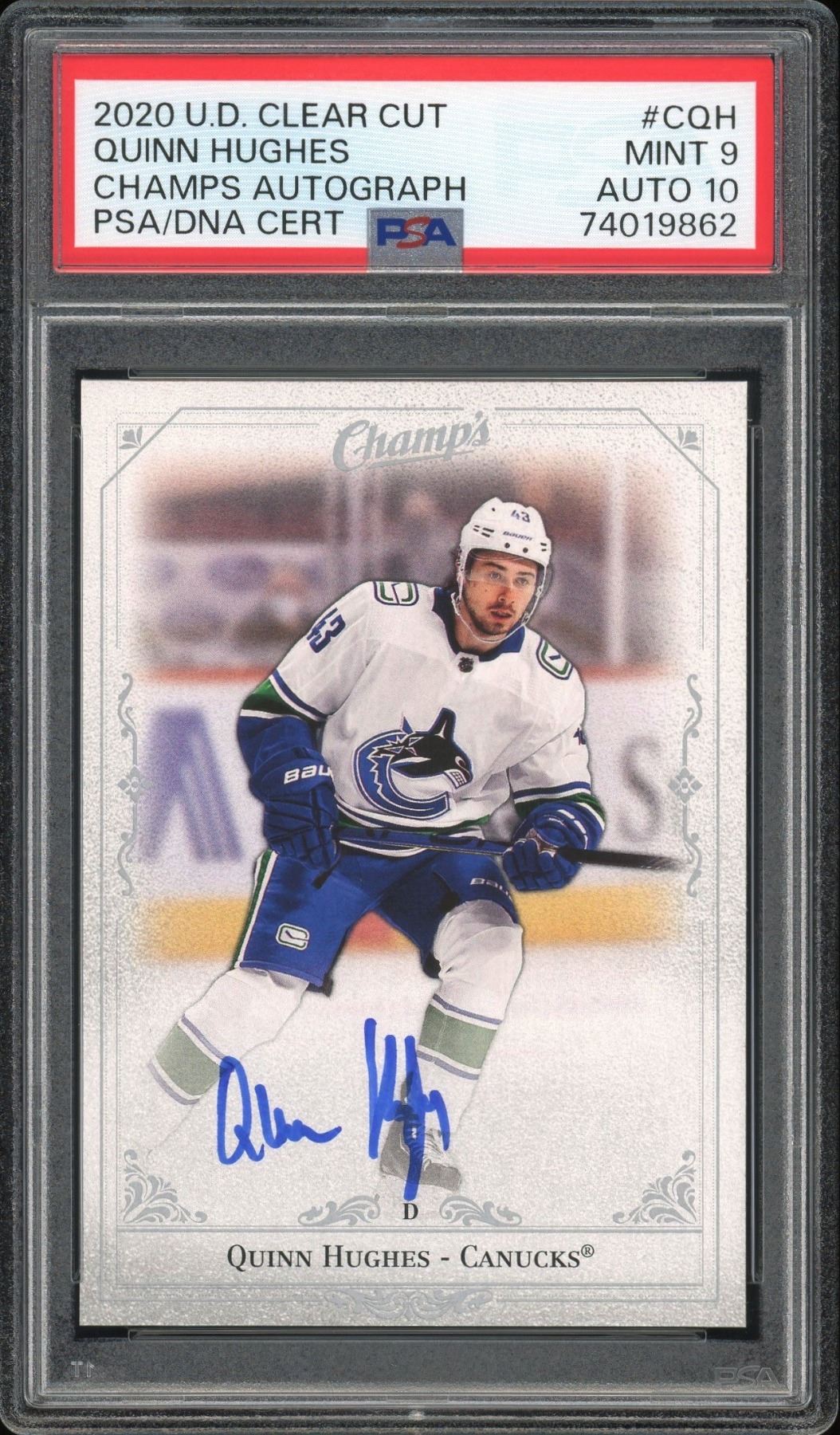 Sharp 2020 UD Clear Cut "Champ's" Autographed Quinn Hughes. The talented defender is among the best in the game and is only getting better. Graded MINT 9 with a 10 Auto, by PSA!