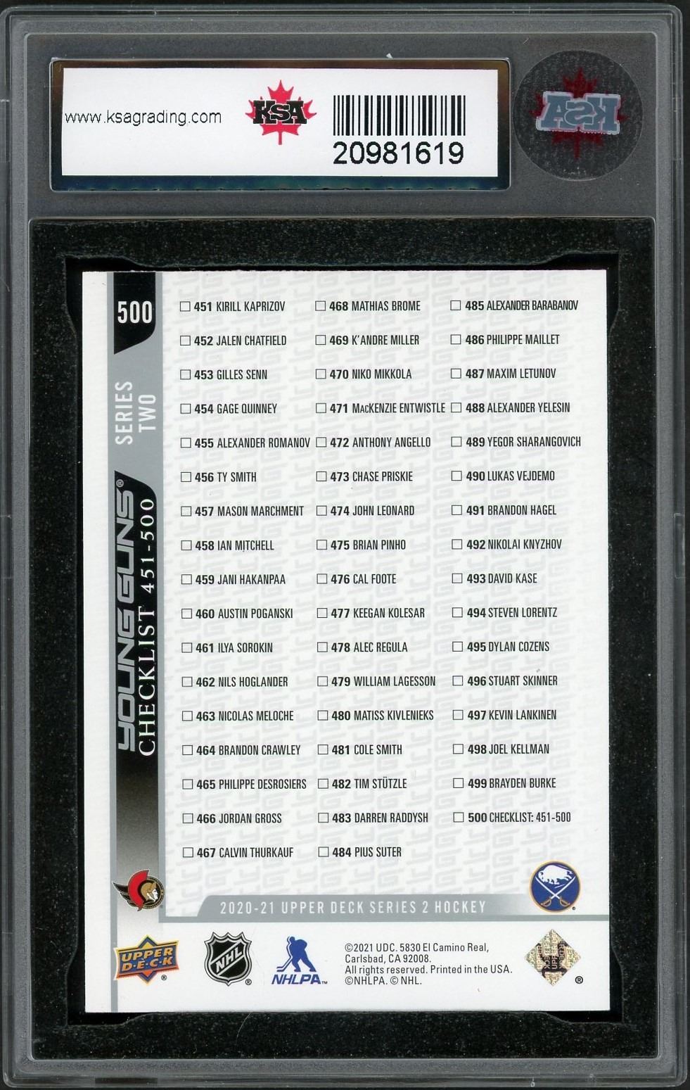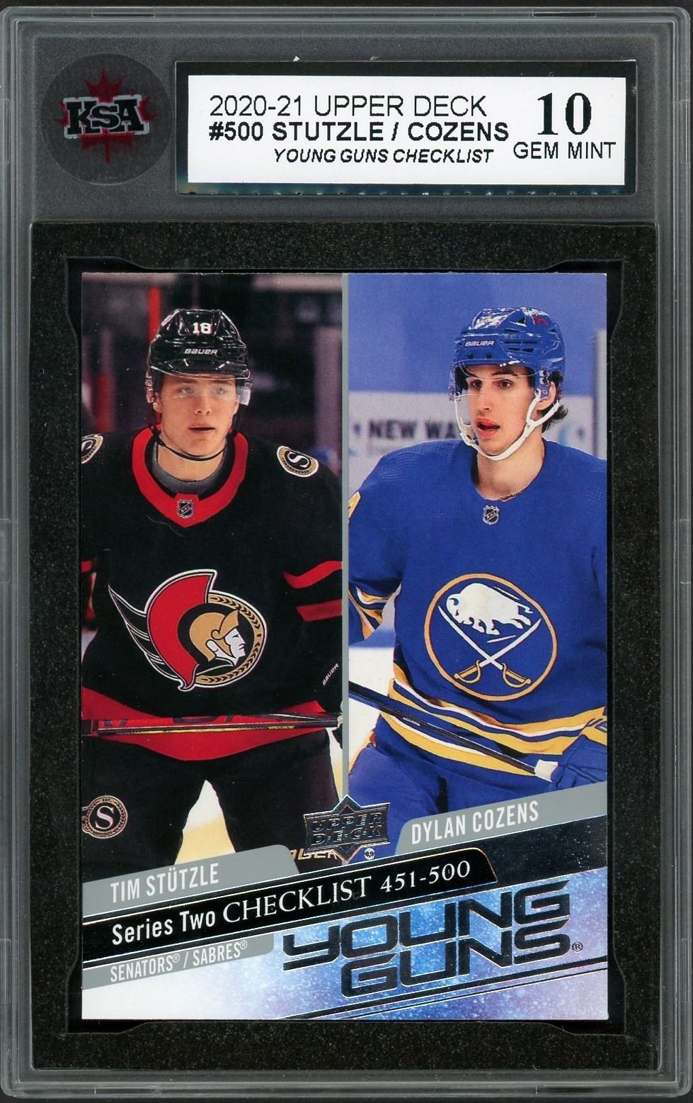 2020-21 Young Guns checklist featuring two young stars in Tim Stutzle from the Ottawa Senators and Dylan Cozens of the Buffalo Sabres. Graded a Gem Mint 10 by KSA!