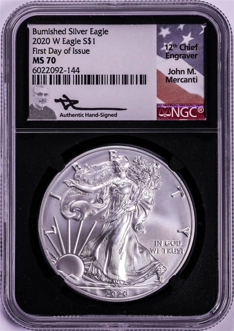 2020-W $1 Burnished American Silver Eagle Coin NGC MS70 Mercanti Signature