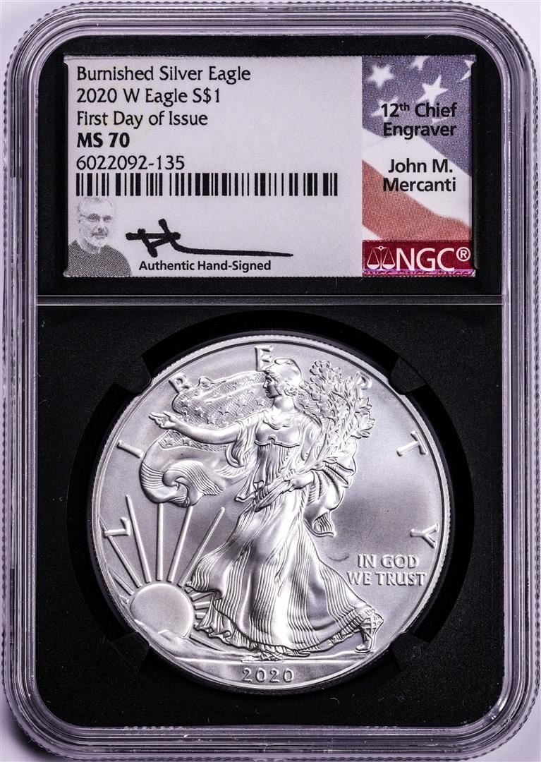 2020-W $1 Burnished American Silver Eagle Coin NGC MS70 Mercanti Signature