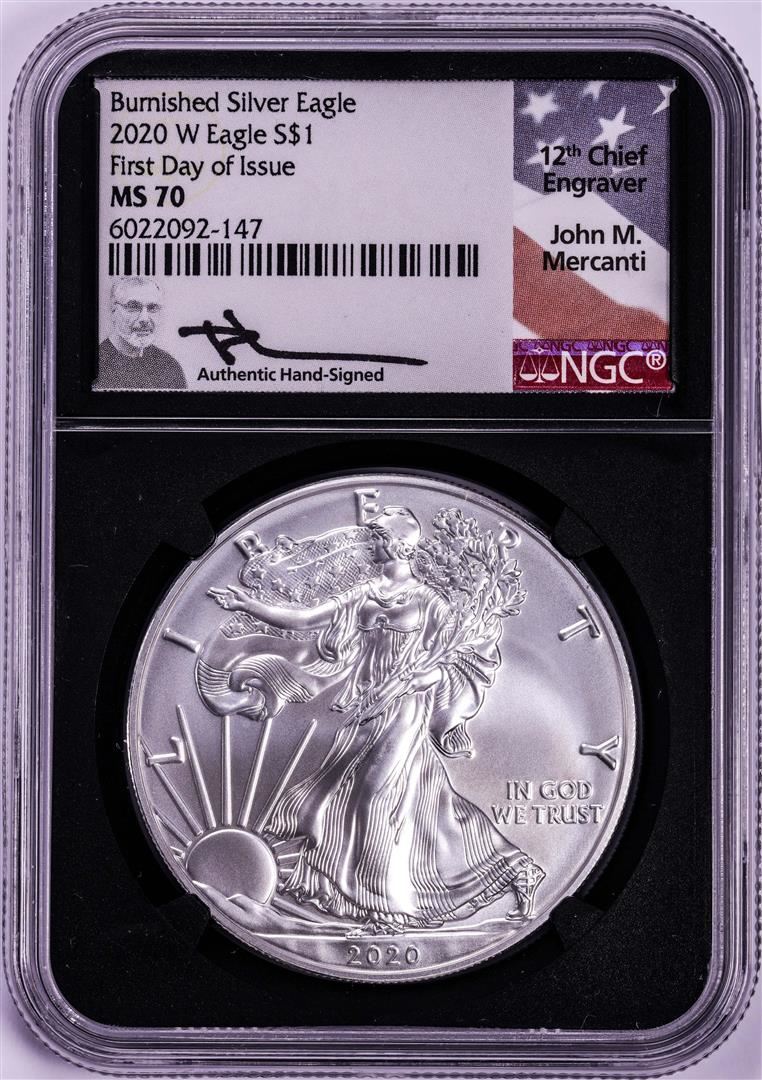 2020-W $1 Burnished American Silver Eagle Coin NGC MS70 Mercanti Signature