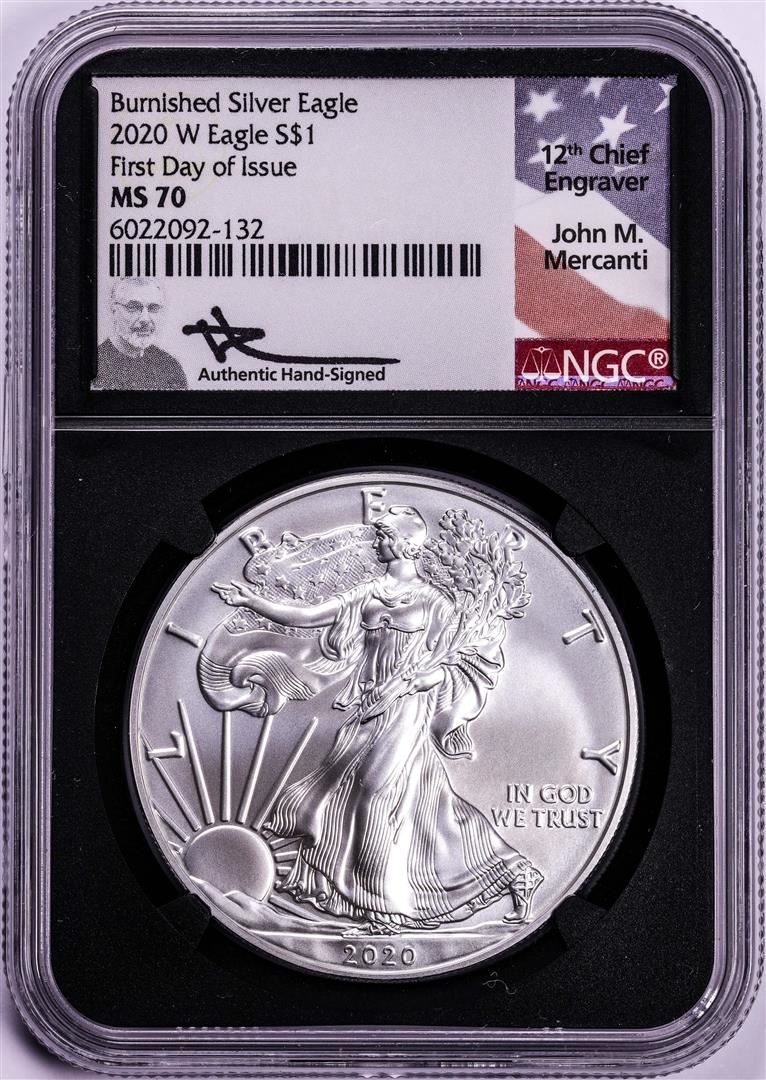 2020-W $1 Burnished American Silver Eagle Coin NGC MS70 Mercanti Signature