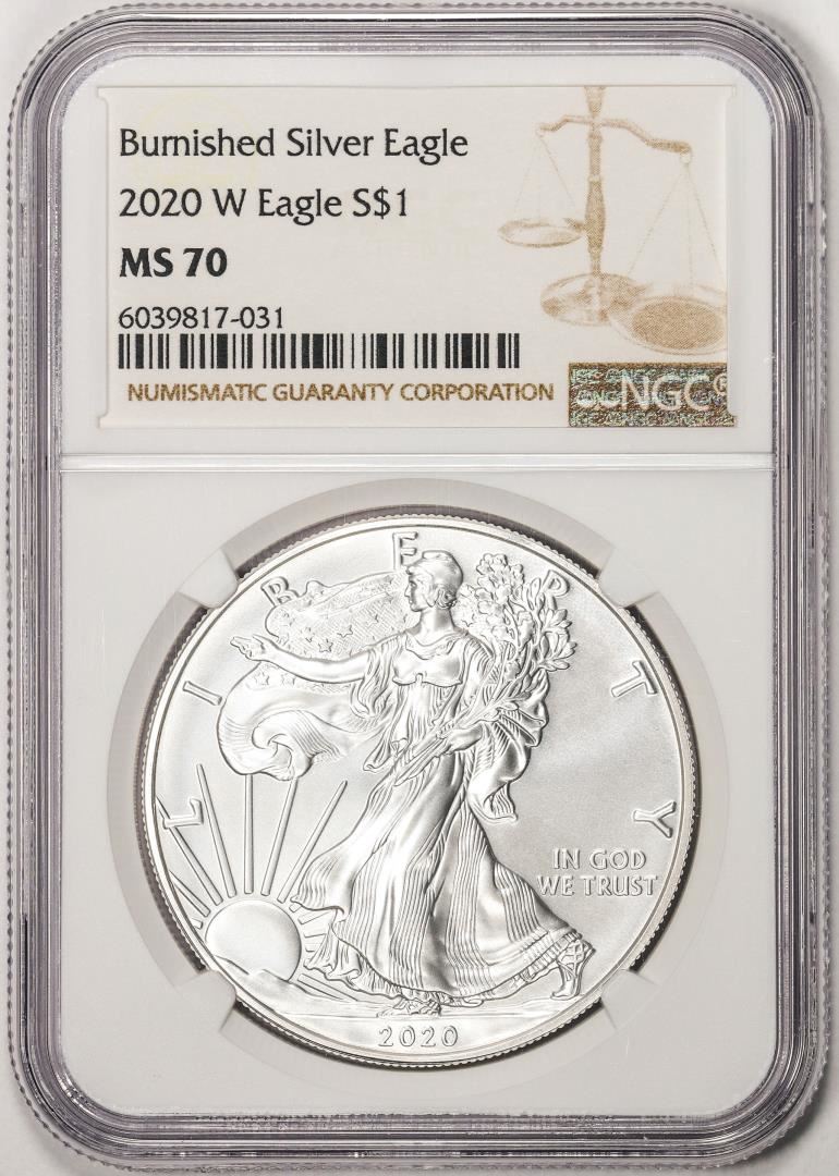 One 2020-W $1 Burnished American Silver Eagle Coin NGC MS70. NGC Certified.