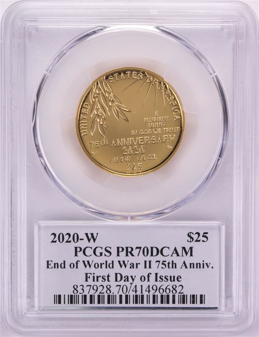 One 2020-W $25 End of World War II 75th Anniversary Gold Coin PCGS PR70DCAM FDOI.