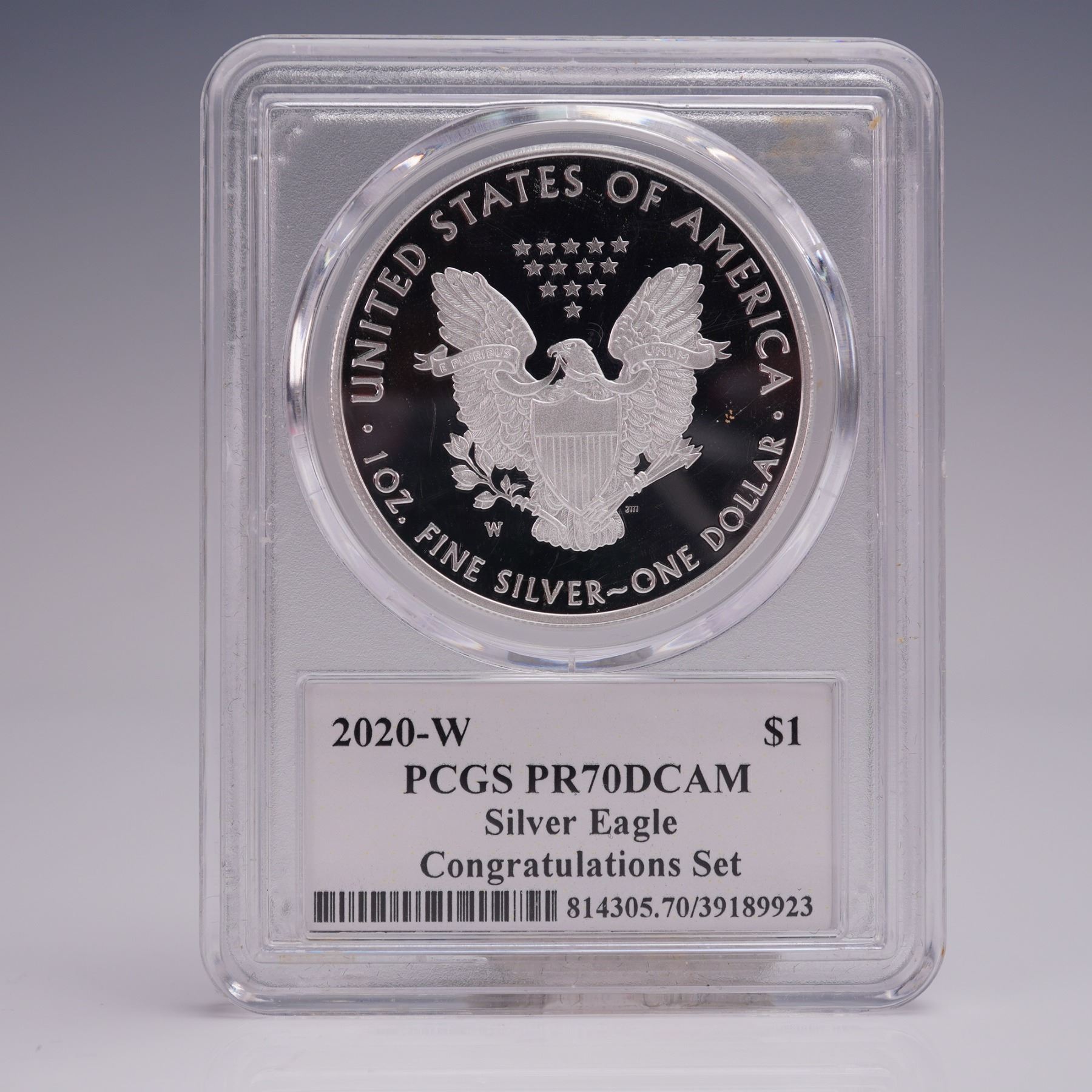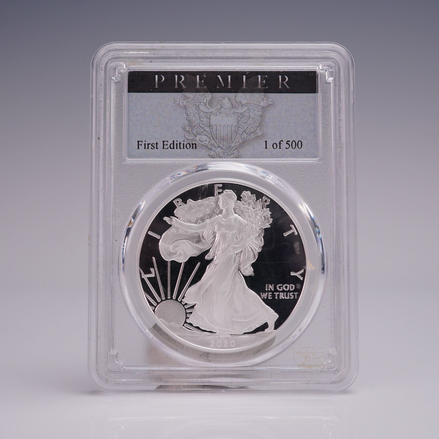 A 2020-W American Silver Eagle one dollar coin, expertly struck at the West Point Mint from one troy ounce of .999 fine silver, awarded a perfect Proof 70 Deep Cameo (PR70DCAM) grade by PCGS. This stunning proof was issued as part of the U.S. Mint's "Congratulations Set" and is further distinguished by its inclusion in the exclusive "Premier" label series, marked as a "First Edition" release and limited to only 500 examples. The obverse features Adolph A. Weinman's revered Walking Liberty design, a timeless portrayal of Liberty striding confidently toward the rising sun, the American flag billowing around her shoulders and arms outstretched with branches of laurel and oak. Below her flowing robe appears the date 2020, while the inscriptions LIBERTY and IN GOD WE TRUST frame the composition. The reverse displays the heraldic eagle design by John Mercanti, with the majestic eagle bearing a shield at its breast, clutching arrows and an olive branch, flanked by the inscription E PLURIBUS UNUM on a ribbon and thirteen stars above symbolizing the original colonies. The "W" mint mark is positioned beneath the eagle's tail feathers. Housed in a graded PCGS slab for further preservation and authentication. Slab measures: 2.25"L x 0.25"W x 3.25"H. Coin diameter: 40.6 mm.