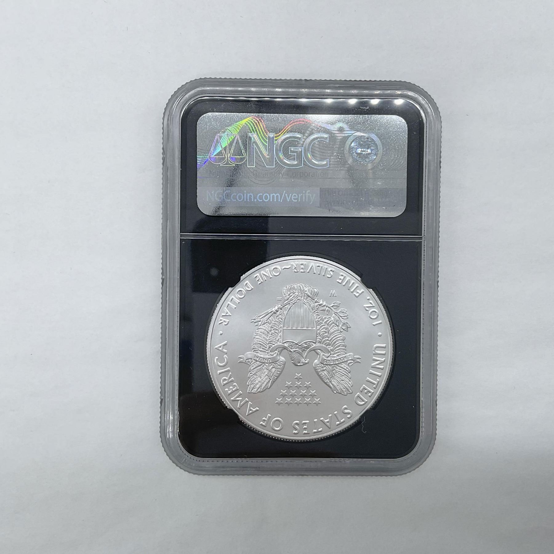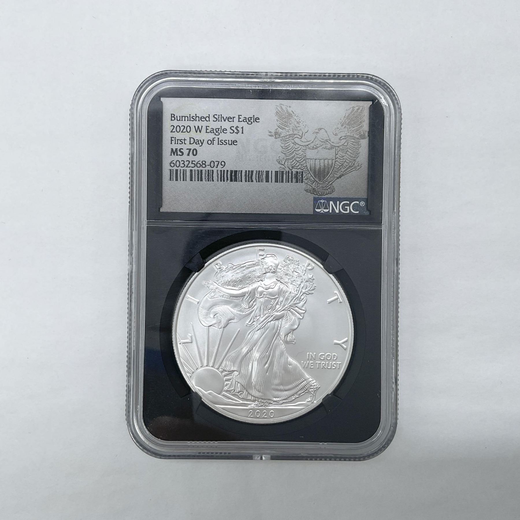 Burnished Silver Eagle. First Day Of Issue. West Point Mint. The obverse side depicts Liberty in full stride. She is shown wrapped in the flag, her right hand is extended and her left arm is carrying laurel and oak branches. The reverse side features the heraldic eagle clutching an olive branch and arrows. The coin is in a protective case. The case is approximately: 2.25"L x 0.5"W x 3.25"H.