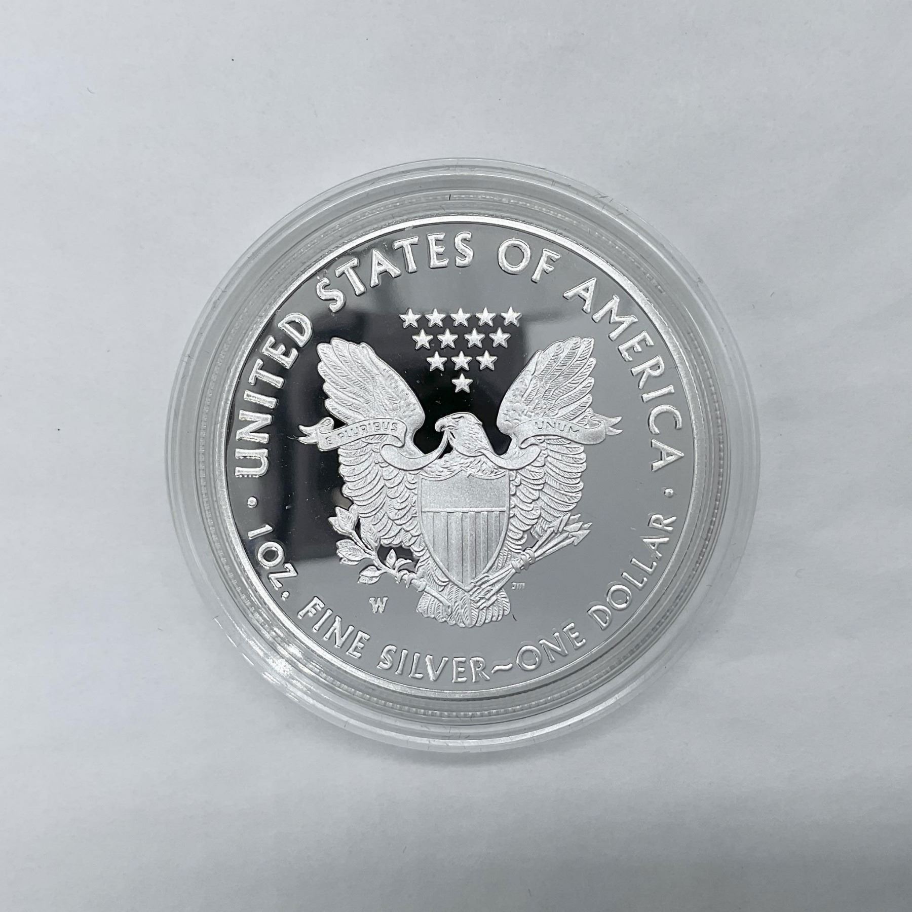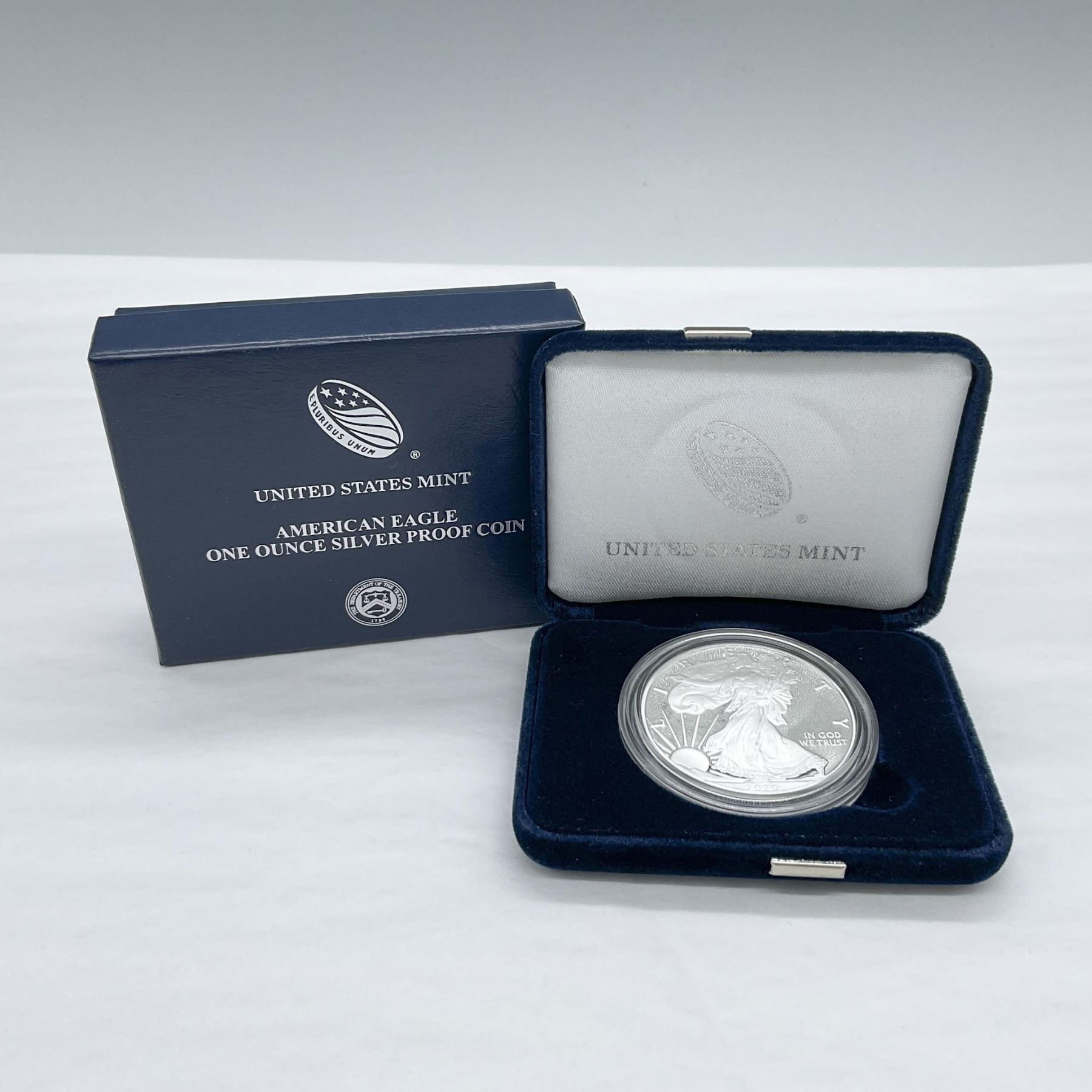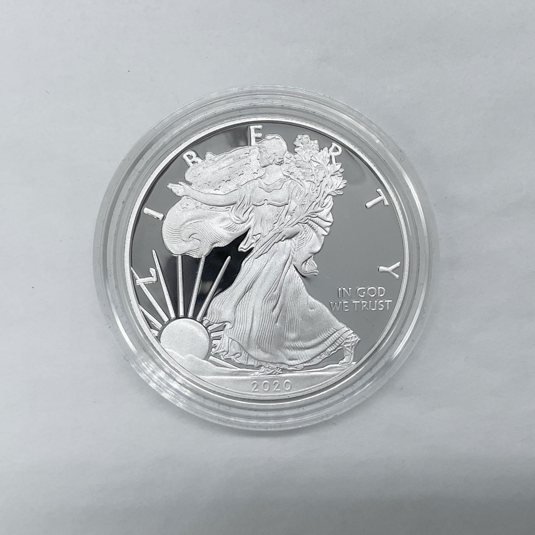 West Point Mint. The obverse side depicts Liberty in full stride. She is shown wrapped in the flag, her right hand is extended and her left arm is carrying laurel and oak branches. The reverse side features the heraldic eagle clutching an olive branch and arrows. The coin is in a protective case. The case is approximately: 0.25"D x 2" dia. This item has its original box: 3.75"L x 3"W x 1"H.