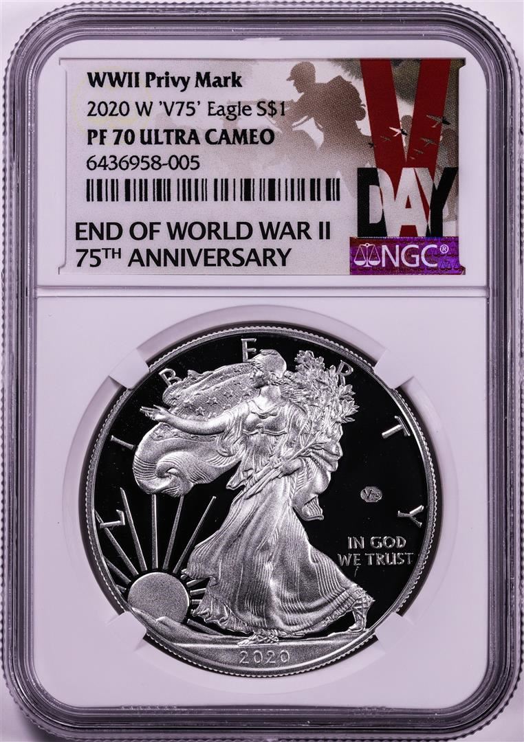 2020-W V75 $1 WWII Privy Mark Proof American Silver Eagle Coin NGC PF70 Ultra Cameo