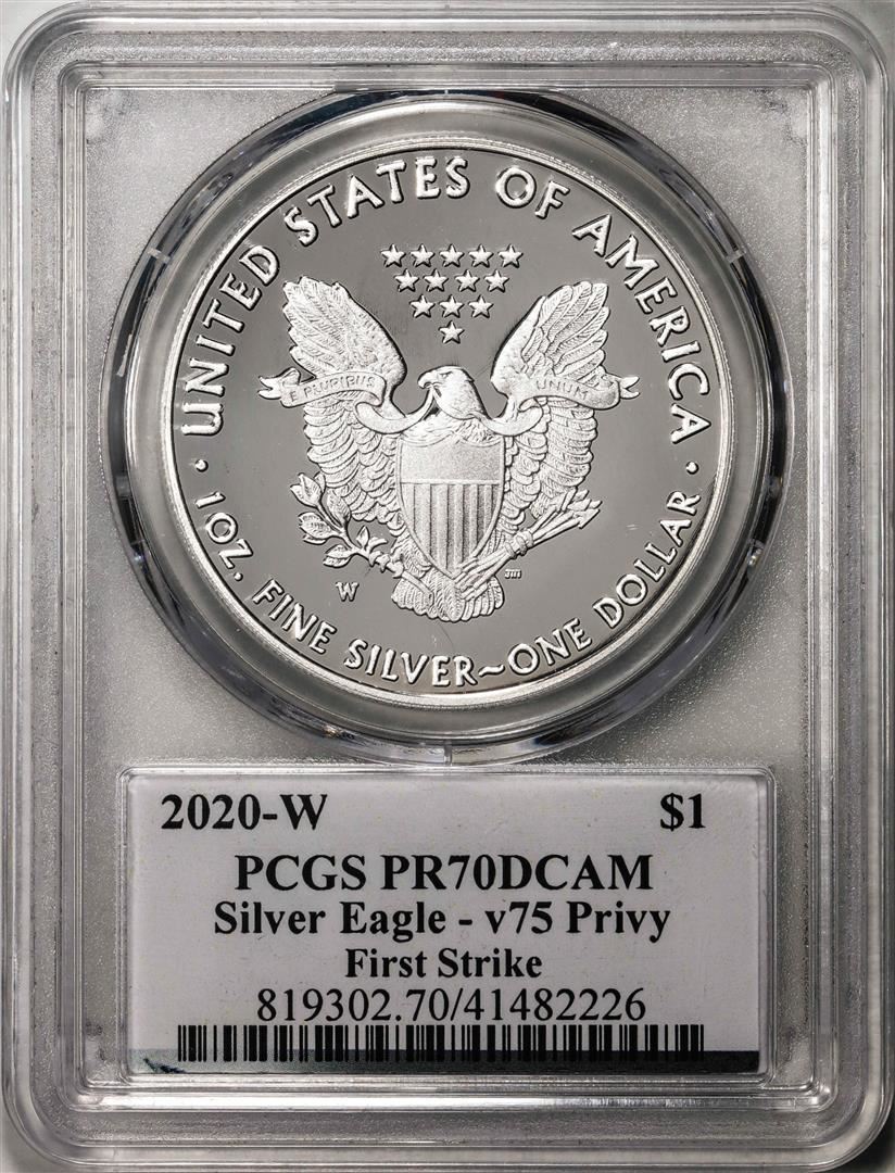 One 2020-W V75 $1 WWII Privy Mark Proof American Silver Eagle Coin PCGS PR70DCAM FS. PCGS Graded.