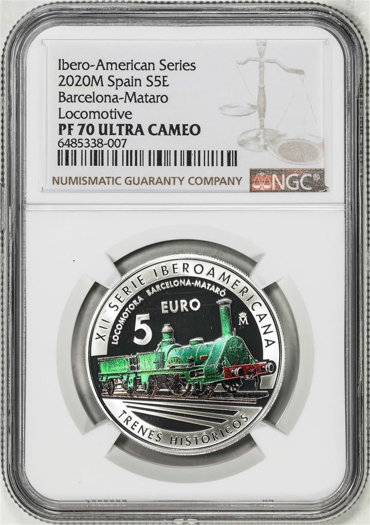 One 2020M Spain 5 Euros Barcelona Locomotive Train Proof Silver Coin NGC PF70 Ultra Cameo. NGC Certified.