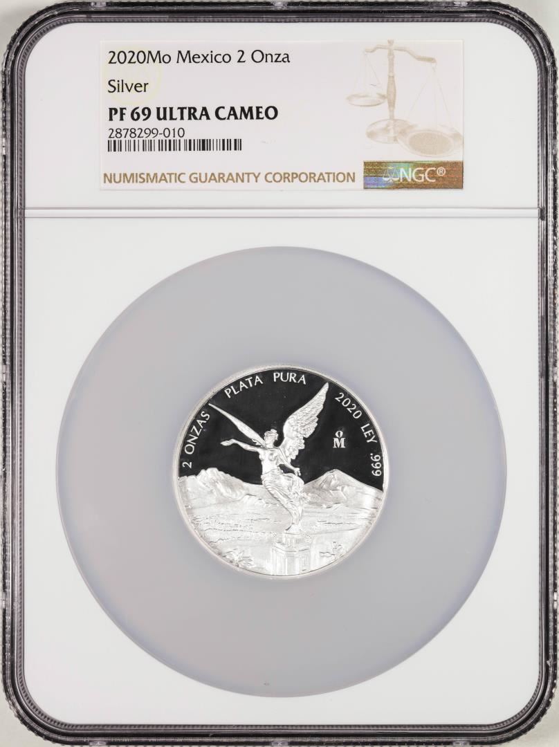 One 2020Mo Mexico Proof 2 Onza Silver Coin NGC PF69 Ultra Cameo. NGC Certified.