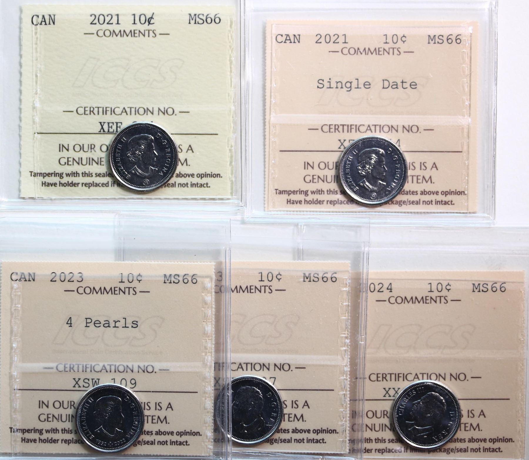 2021 10¢, 2021 "Single Date", 2023 "4 Pearls", 2023, 2024. Lot of 5 coins all ICCS Superb Gem Mint State-66