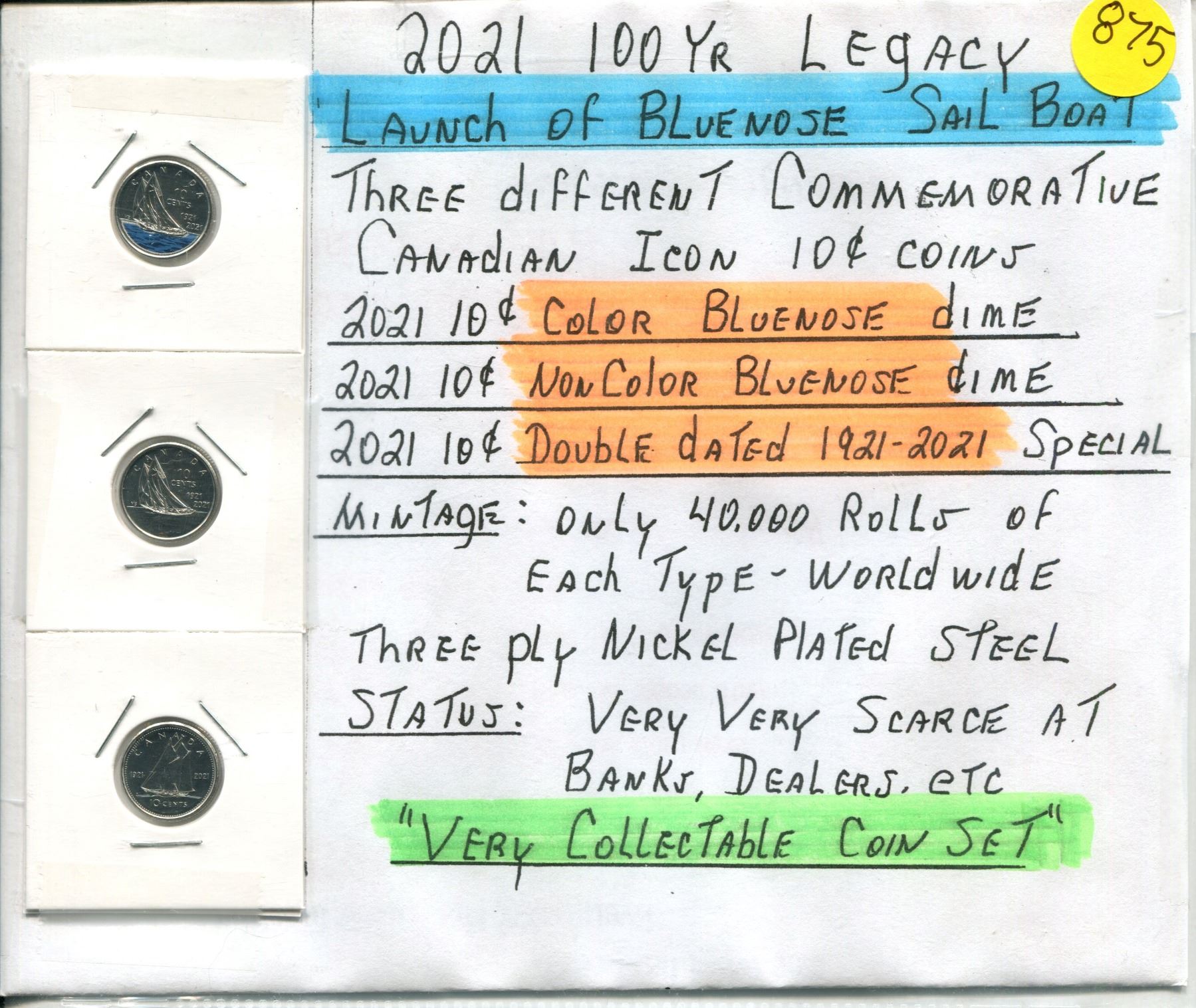 2021 100 Year Legacy, Launch of Bluenose 10¢ (3) - Colour, Non-Colour, Double Dated 1921-2021