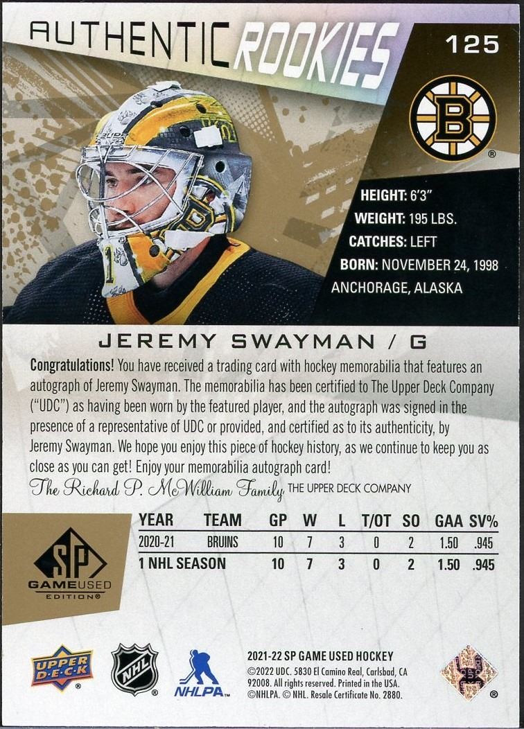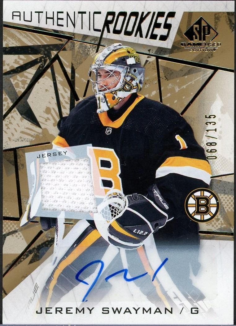 2021-22 SP Game Used RPA of star goalie Jeremy Swayman #'d to 135