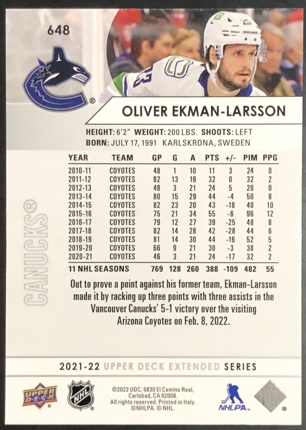 Tim Hortons card #648 UD, regional, NHL, hockey