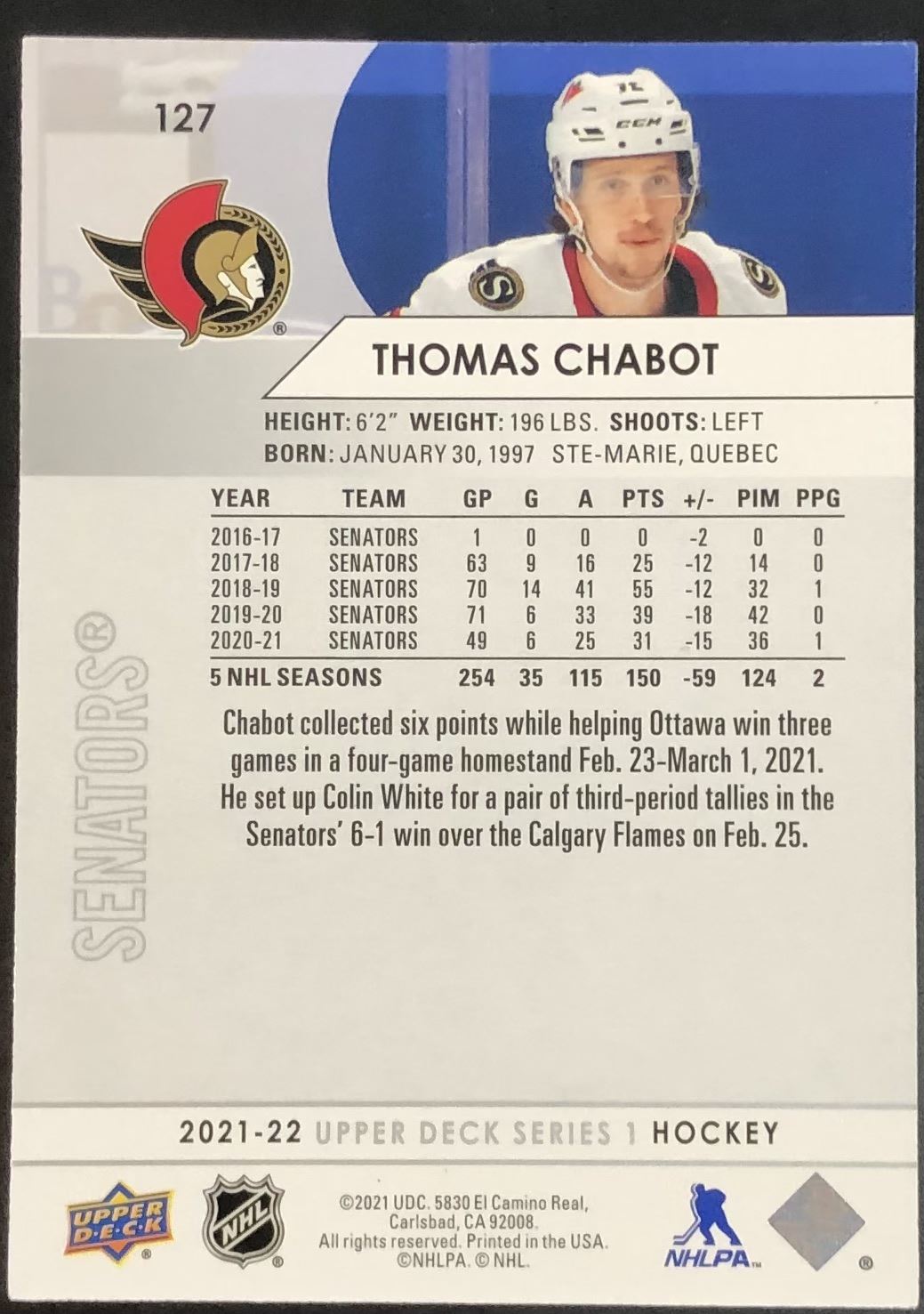 Tim Hortons card #127 UD, regional, NHL, hockey
