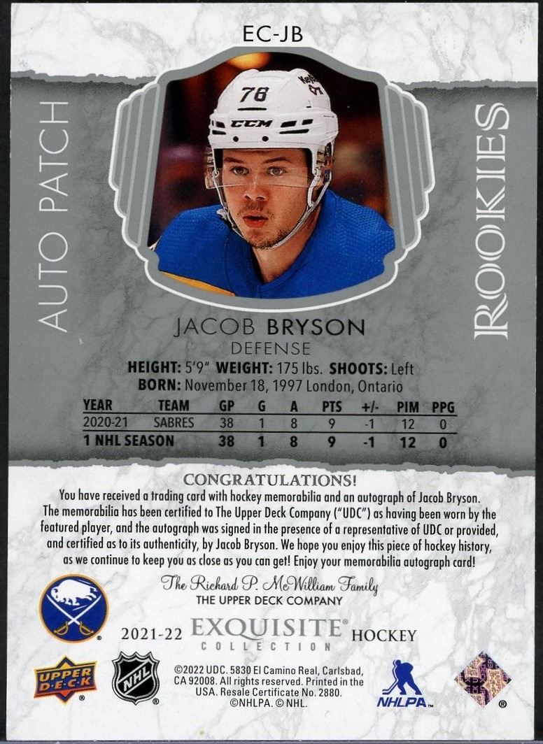 2021-22 UD Exquisite Collection RPA of Sabres Dman Jacob Bryson #'d to 78