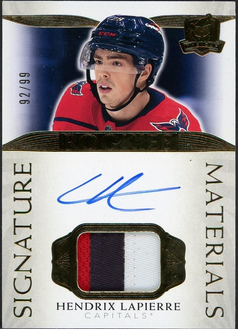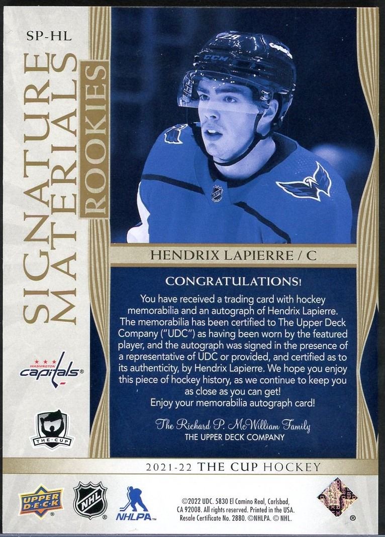 2021-22 UD The Cup Signature Materials rookie patch auto card of Washington Capitals forward Hendrix Lapierre #'d to 99!