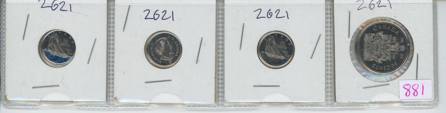 2021 - 4 Canadian coins - 3-10 cent coins (one is coloured) & 1-50 cent coin