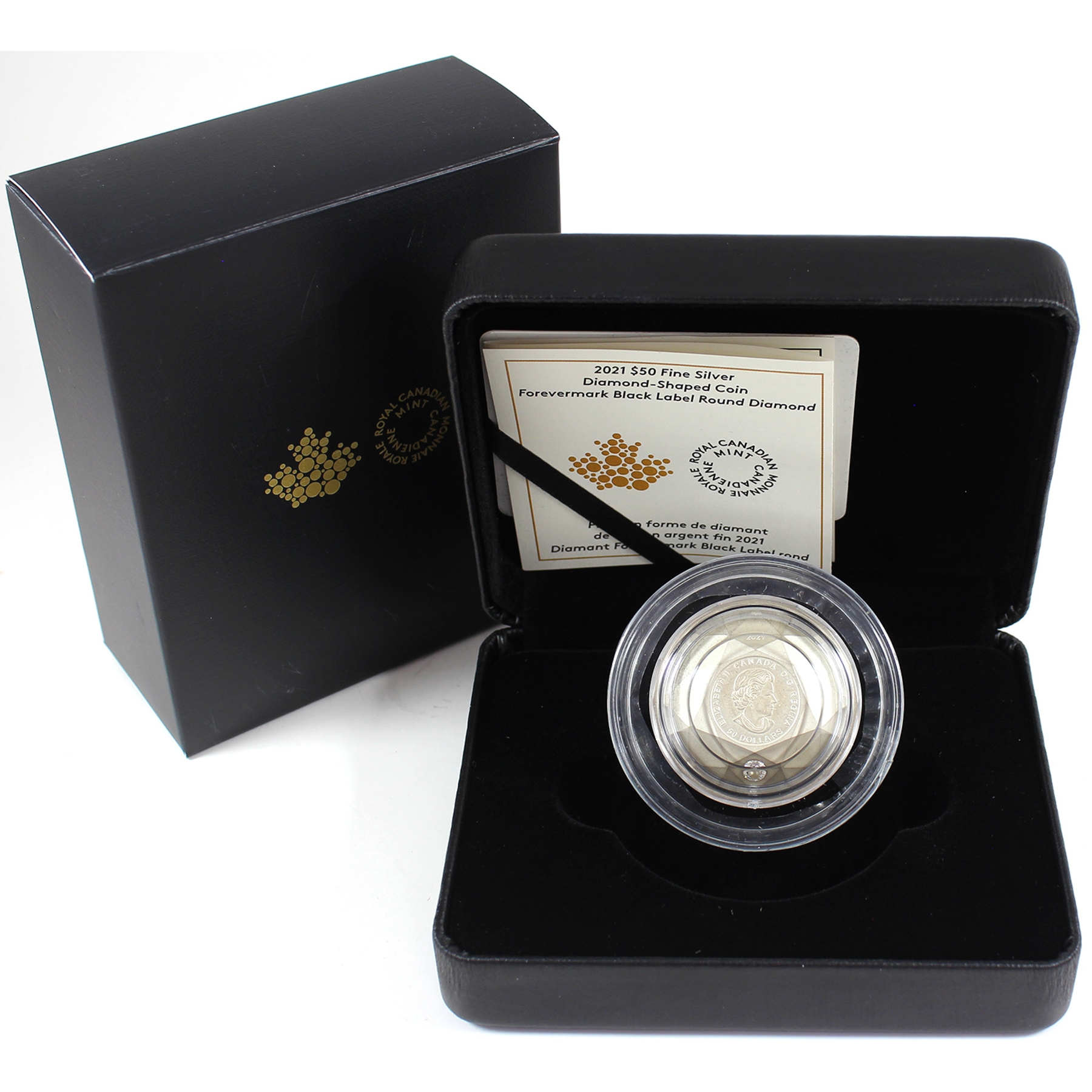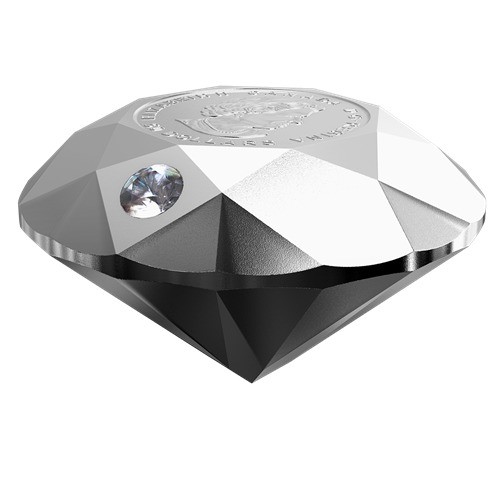 Coin is 3oz and .9999 fine with a 0.20-vt Forevermark Black Label round diamond embedded in. The diamond was sourced from Northern Ontario. (Tax Exempt)