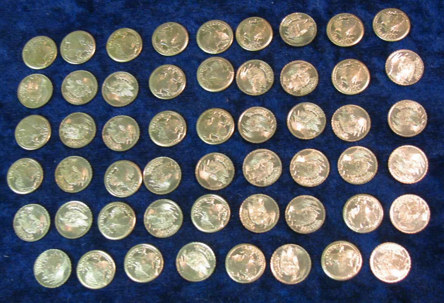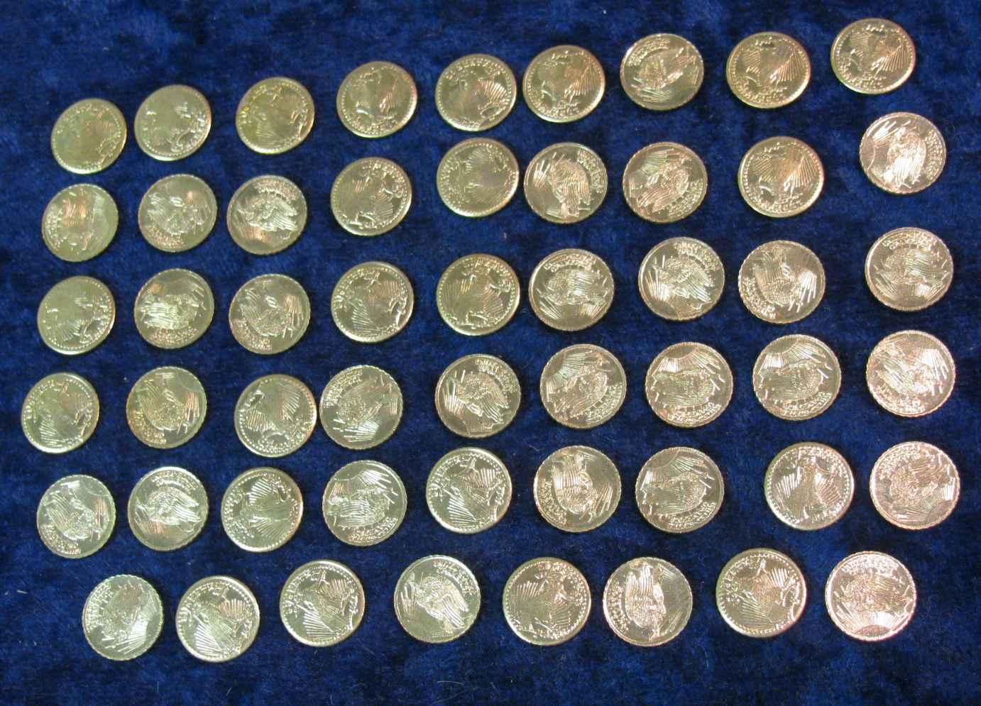 2021. (55) Miniature St. Gaudens Gold Pieces. All Gold-plated. We will sell this group at 55 x the money, so bid for one coin up to 55. All BU.
