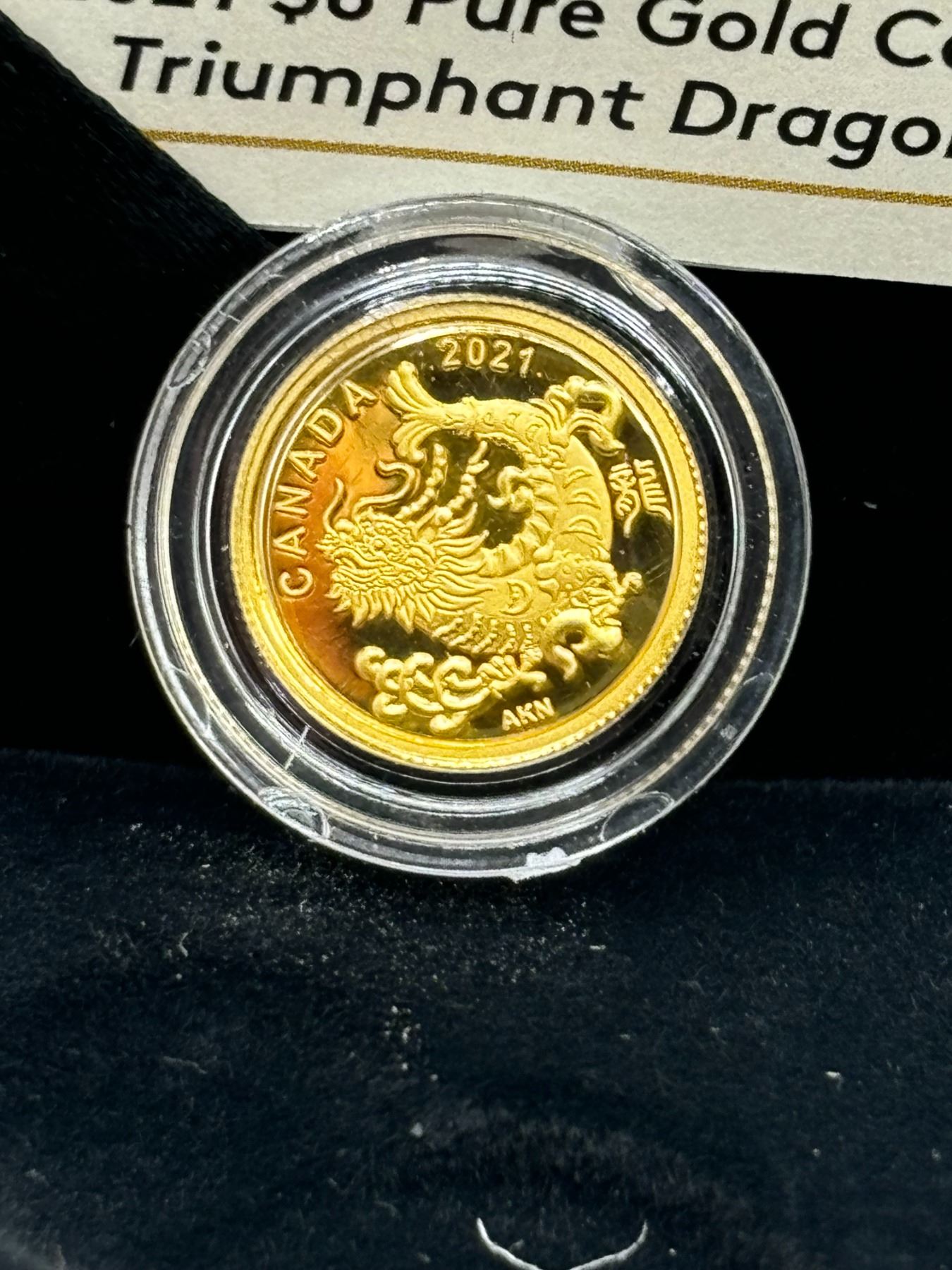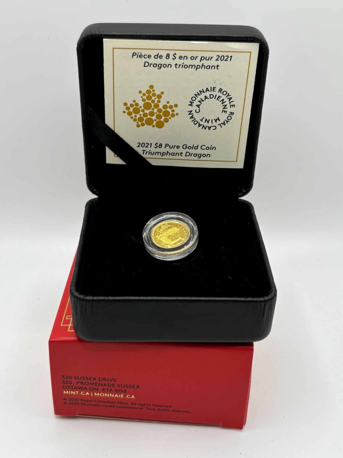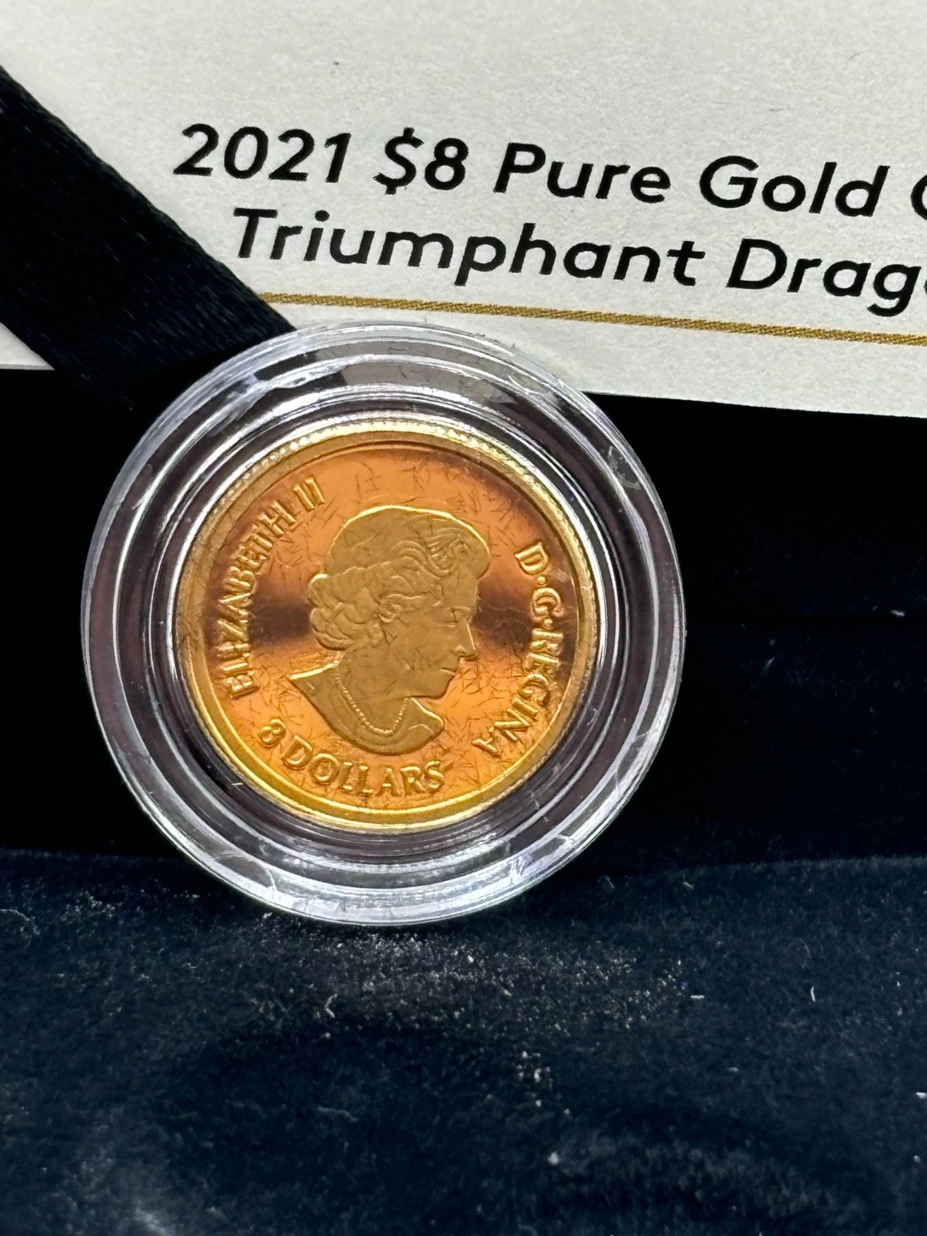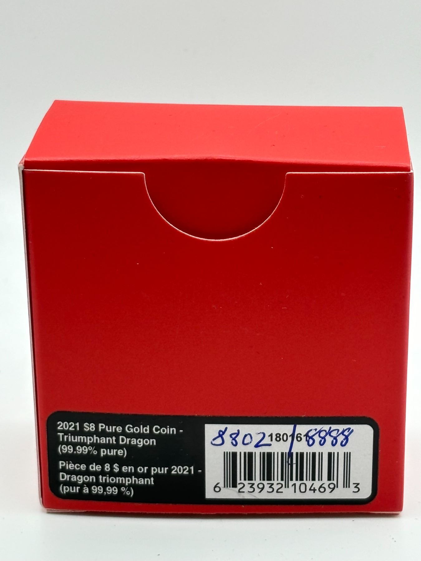2021 $8 Pure Gold Coin, Triumphant Dragon. Contains 1.58 grams of .9999 fine gold. Comes as issued with COA and outer box. Tax Exempt