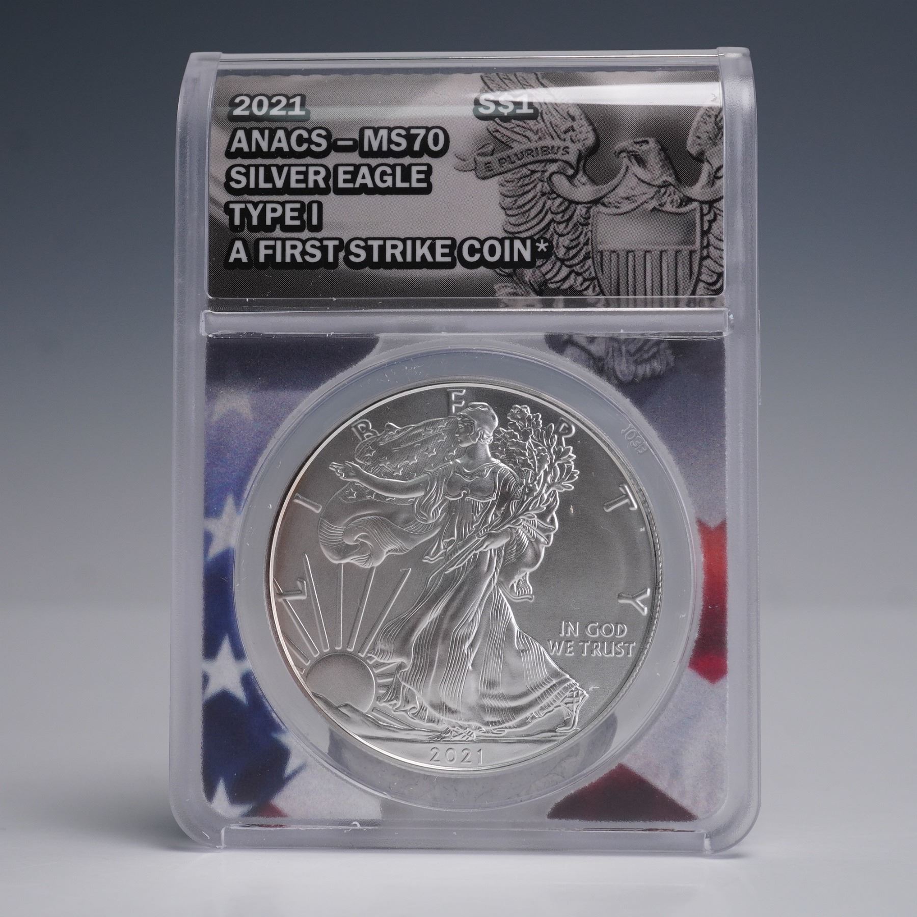 American Silver Eagle 2021 one ounce silver coin, certified MS70 by ANACS. Struck in .999 fine silver, this Type 1 First Strike edition features Weinman's classic Walking Liberty obverse paired with Mercanti's heraldic eagle reverse. Presented in an ANACS protective holder. Case measures 2.5"L x 3.25"H.