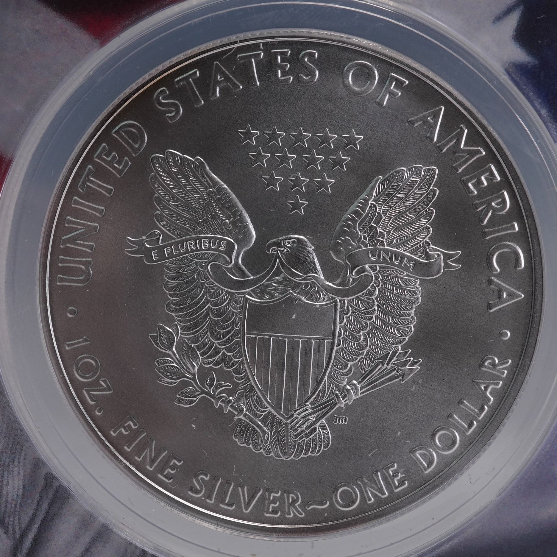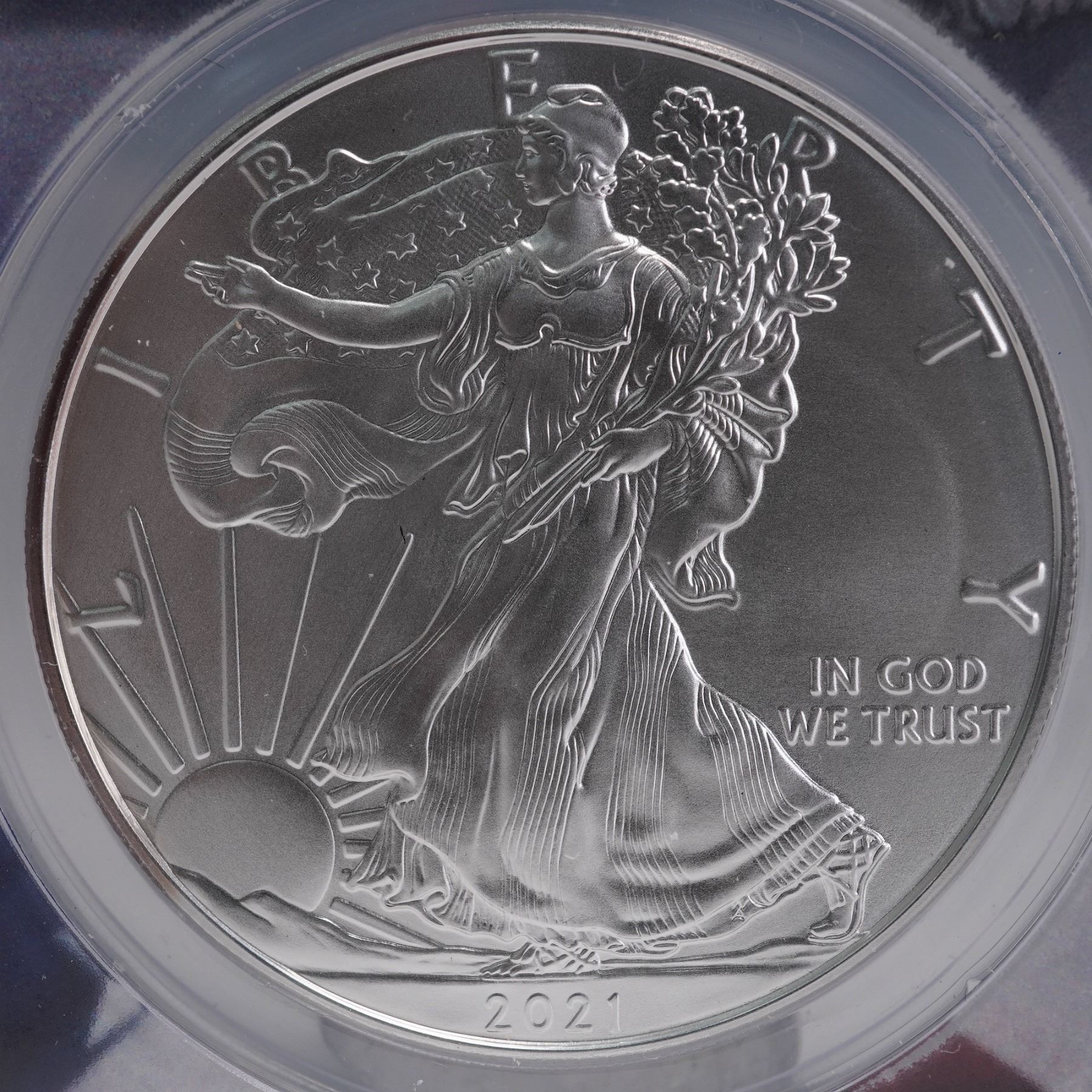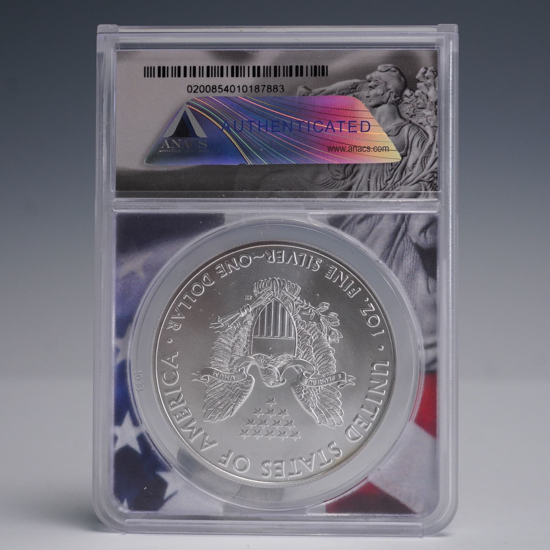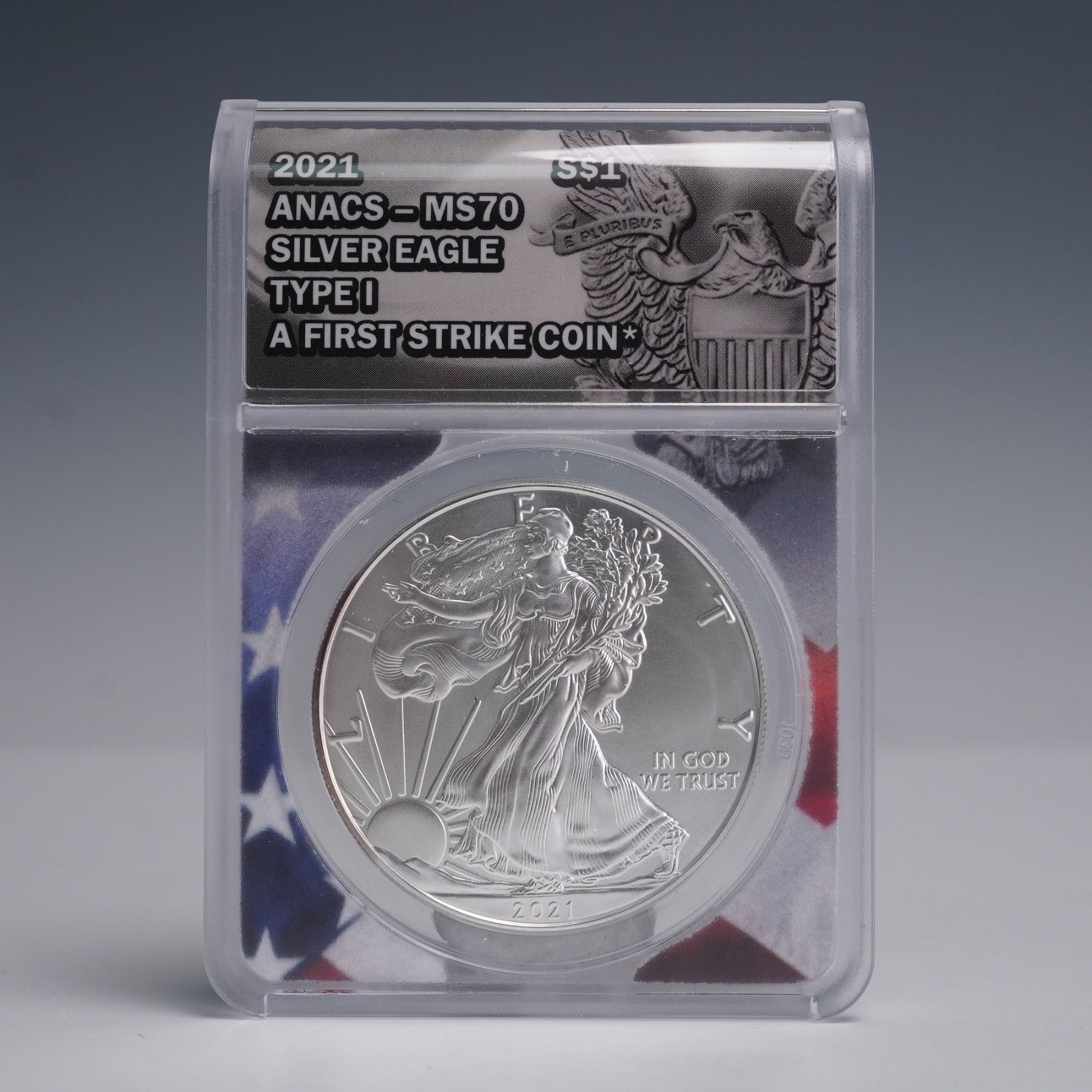 American Silver Eagle 2021, one ounce .999 silver coin graded ANACS MS70. First Strike Type 1 with iconic Walking Liberty and heraldic eagle designs. Housed in a secure ANACS slab for display and preservation. Case measures 2.5"L x 3.25"H.