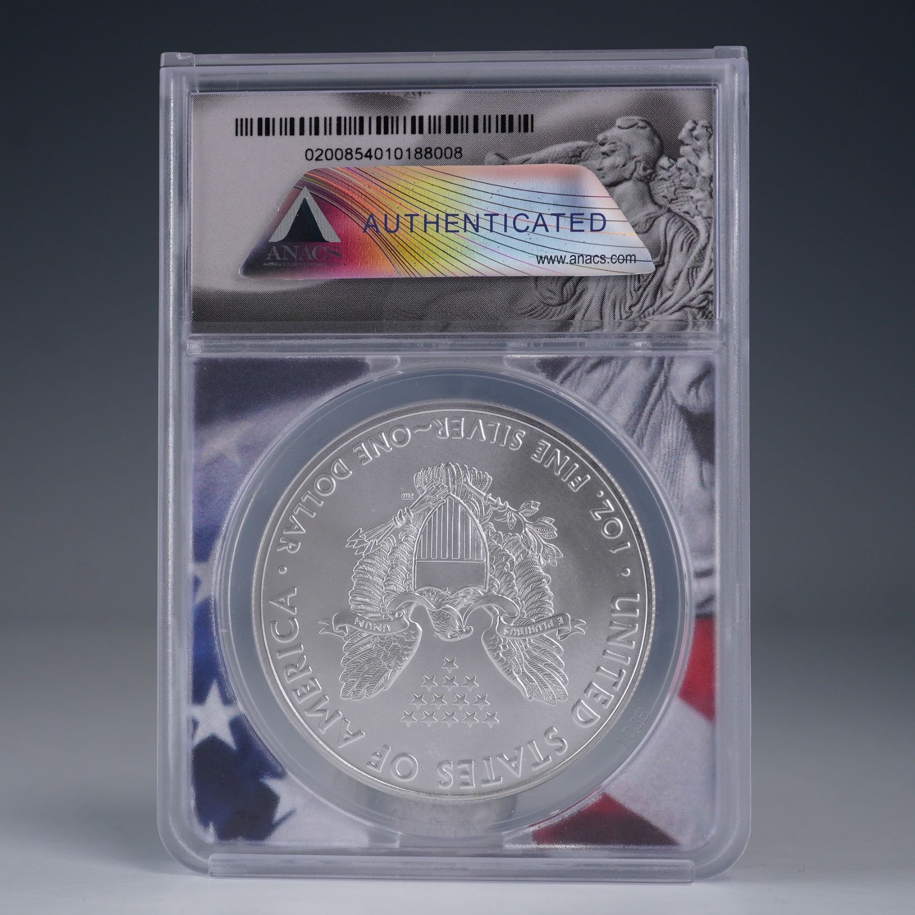 2021 American Silver Eagle one ounce silver bullion coin graded MS70 by ANACS. Designated as a First Strike coin, this Type 1 issue features the classic Walking Liberty obverse by Adolph A Weinman and the heraldic eagle reverse by John Mercanti. The coin is struck in .999 fine silver and comes encapsulated in a tamper-evident holder with an ANACS label. A perfect specimen for collectors of American silver bullion. Case measures 2.5"L x 3.25"H.