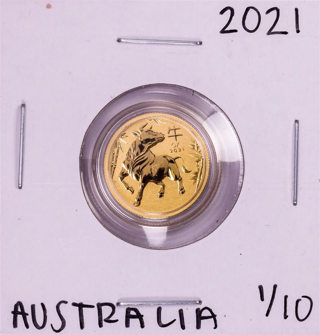 One 2021 Australia $15 Lunar Year of the Ox 1/10 Oz Gold Coin.