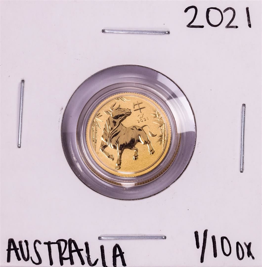 One 2021 Australia $15 Lunar Year of the Ox 1/10 Oz Gold Coin.