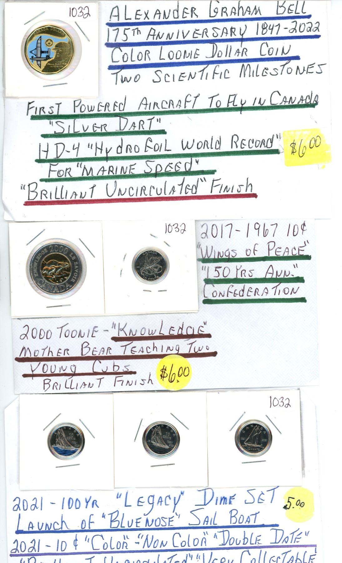 2021 Bluenose Legacy dime set - uncirculated - Alexander Graham Bell 1847-2022 Loonie & 2000 "Knowledge" Toonie and 1967-2017 "Wings of Peace" 10 cent dime