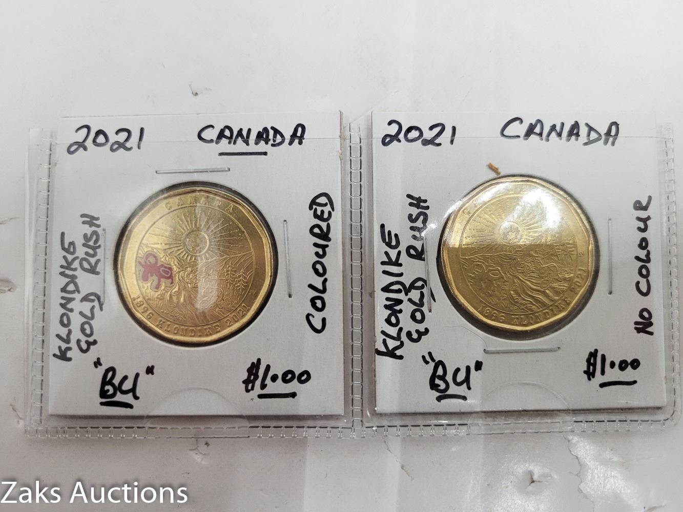 2021 CANADIAN $1.00 COIN KLONDIKE GOLD RUSH (1 COLOURIZED AND 1 NON-COLOURED) + UNC 2010 COLOURED POPPY QUARTER