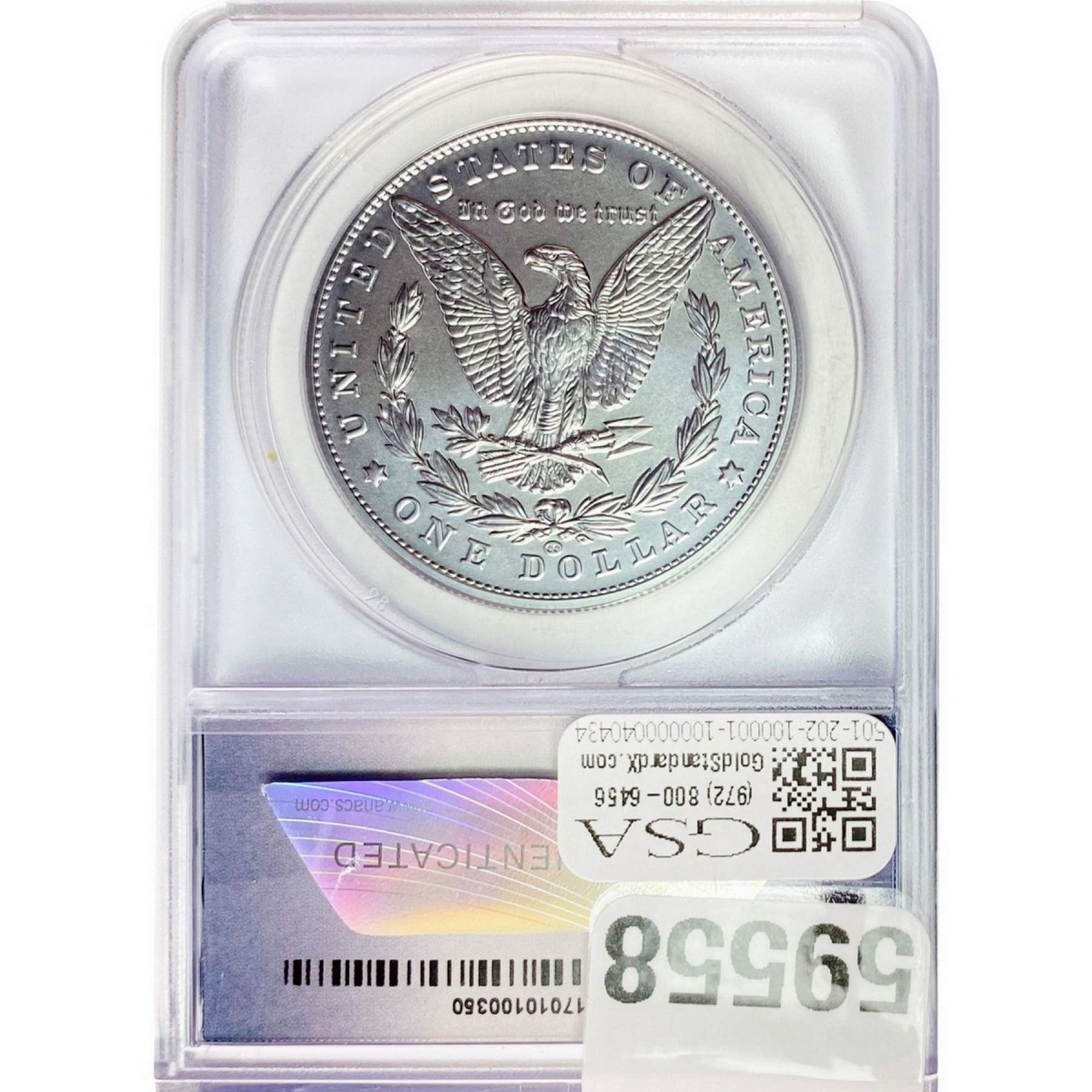 e. Coins sold referencing a third-party grading service are sold “AS IS” without any express or implied warranty, except for a guarantee by GSA that they are genuine. Removal or alteration of the holder, voids all of Bidder’s claims concerning that Product. Certain warranties may be available from the grading services and Bidders are referred to them for further details: Numismatic Guaranty Corporation (NGC), PO Box 4776, Sarasota, FL 34230, www.ngccoin.com/services/writtenguarantee.asp; Professional Coin Grading Services (PCGS), PO Box 9458, Newport Beach, CA 92658, www.pcgs.com/guarantee.html; ANACS, 6555 S. Kenton St., Ste. 303, Englewood, CO 80111; and Independent Coin Grading Co. (ICG), 7901 East Bellview, Ave., Suite 50, Englewood, CO 80111.