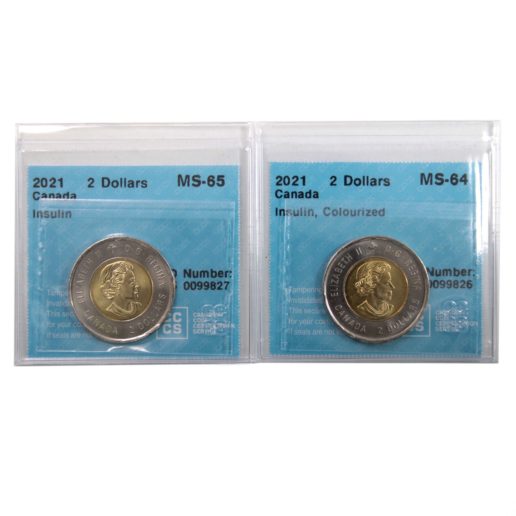 2021 Canada $2 Insulin Coloured CCCS Certified MS-64 & Plain CCCS Certified MS-65. 2pcs