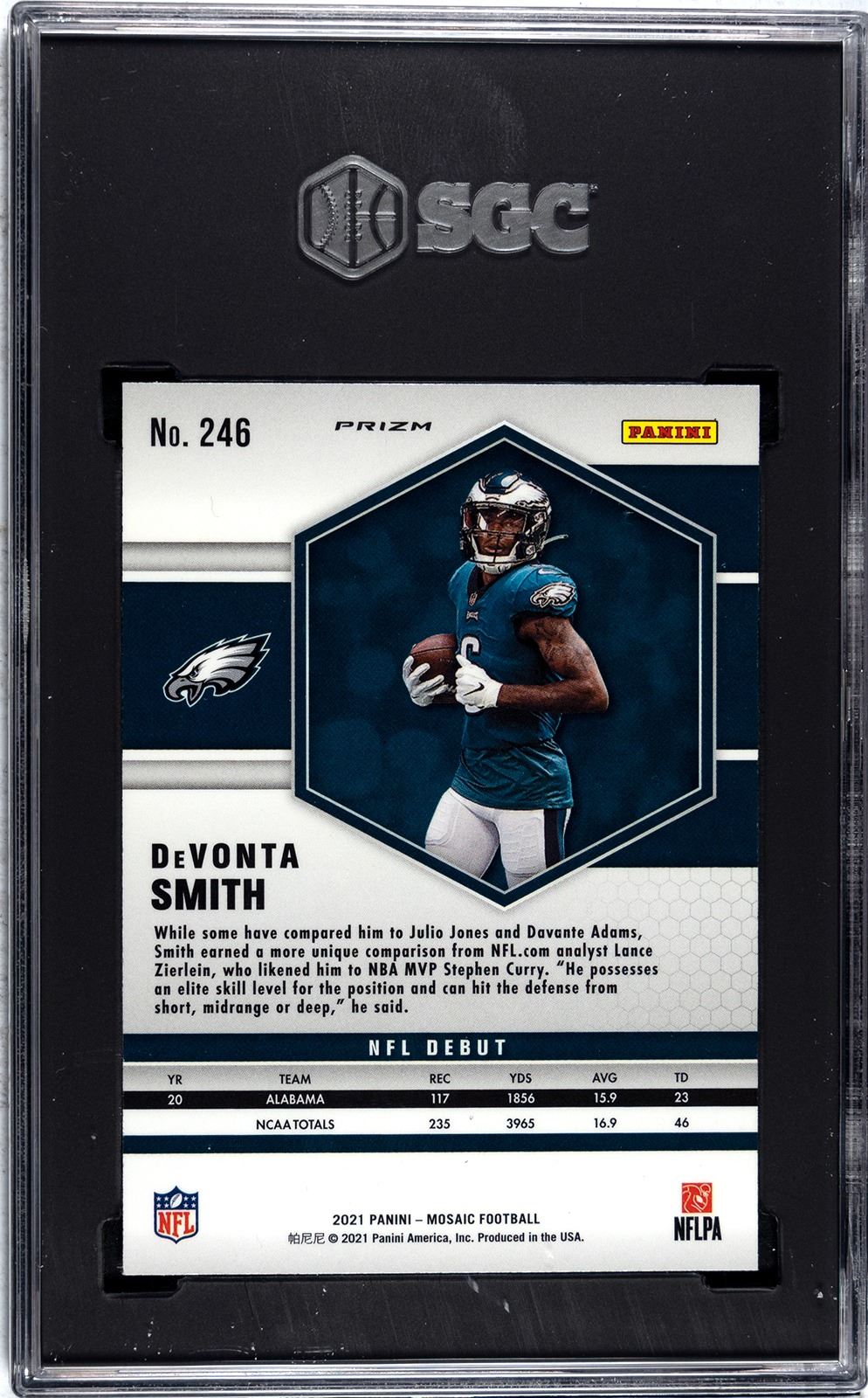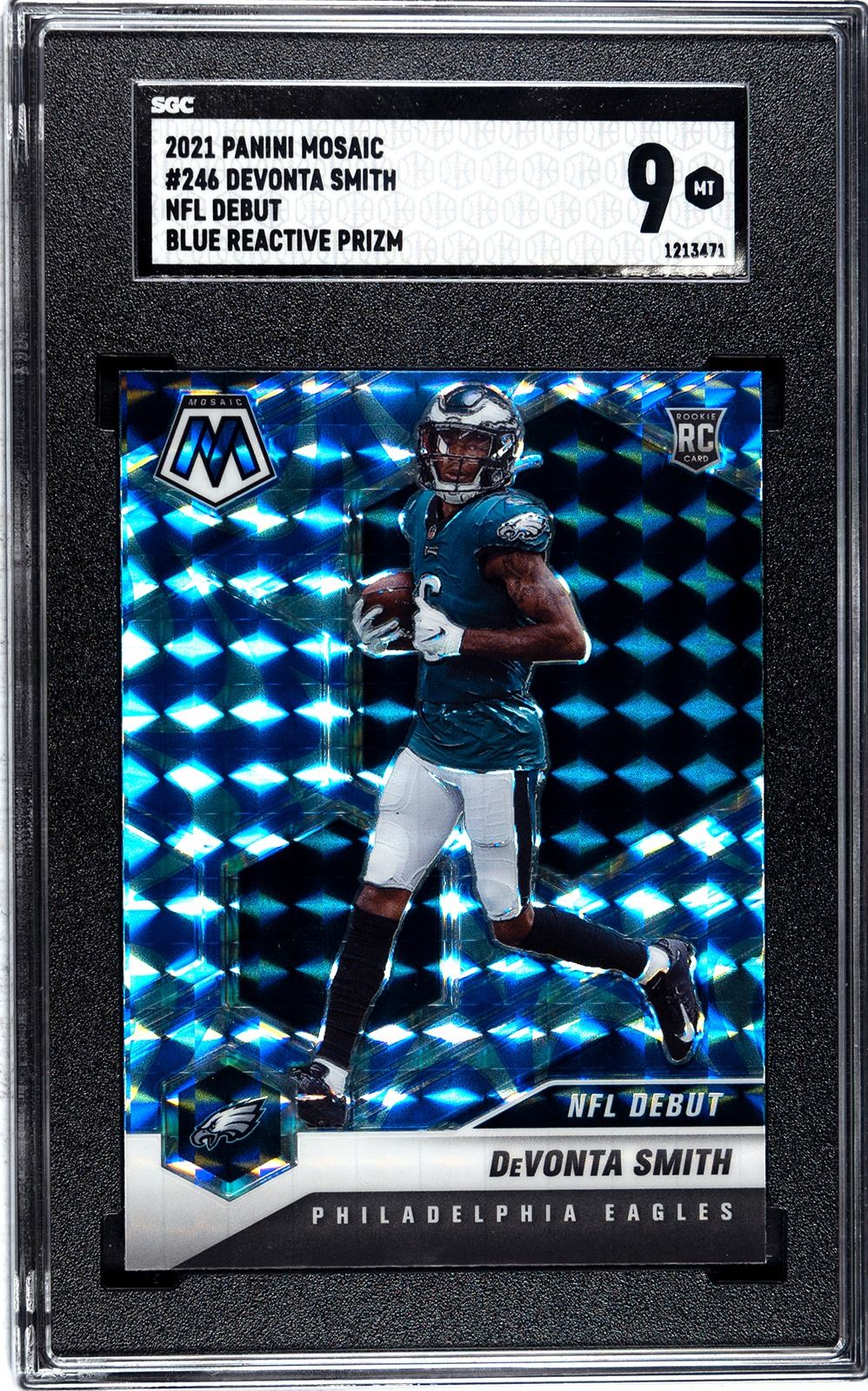 2021 Panini Mosaic NFL Debut Blue Reactive Prism, #246 Devonta Smith RC, graded 9 MINT by SGC.