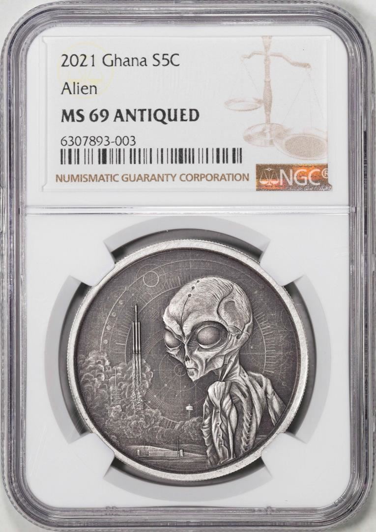 One 2021 Ghana 5 Cedis Alien Silver Coin NGC MS69 Antiqued. NGC Certified.