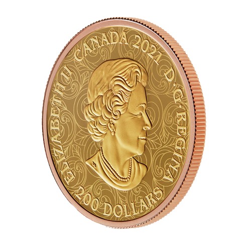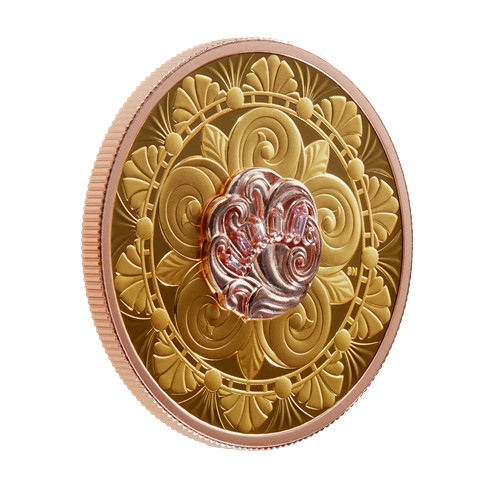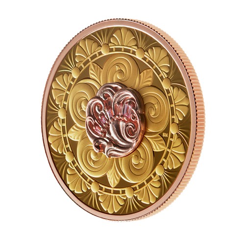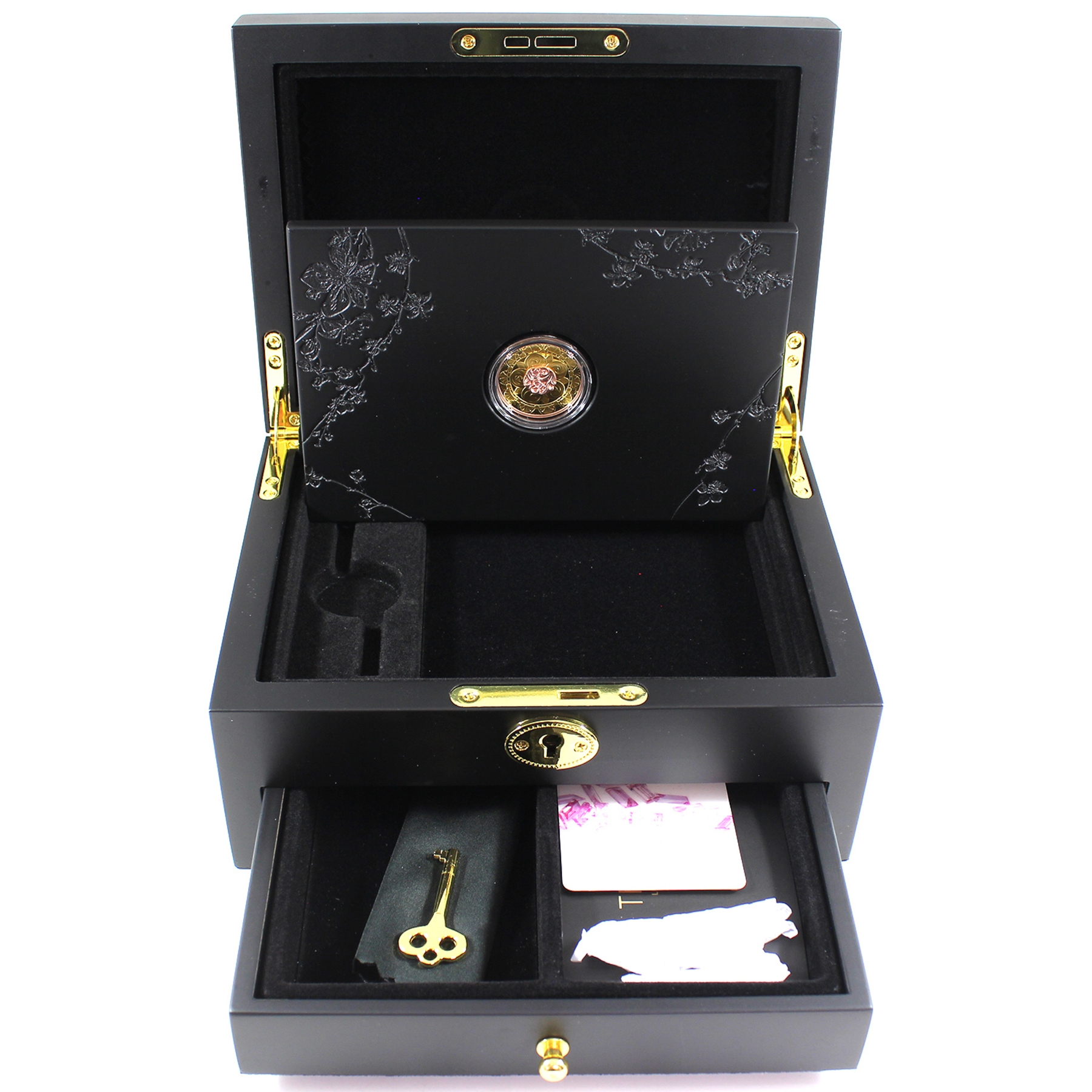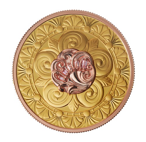 Mintage of only 400! Coin is 1oz and .99999 pure gold, with rose gold plating in the design of a cherry blossom. 5 pink diamonds from the Argyle mine - the rarest diamonds in the world - are embedded in the centre of the flower to create a stunning piece of art. An additional container holds a pair of black gloves for safe handling. This coin also comes with 2 COAs, one serialized, one from Crossworks Manufacturing, and a key. (Tax Exempt)