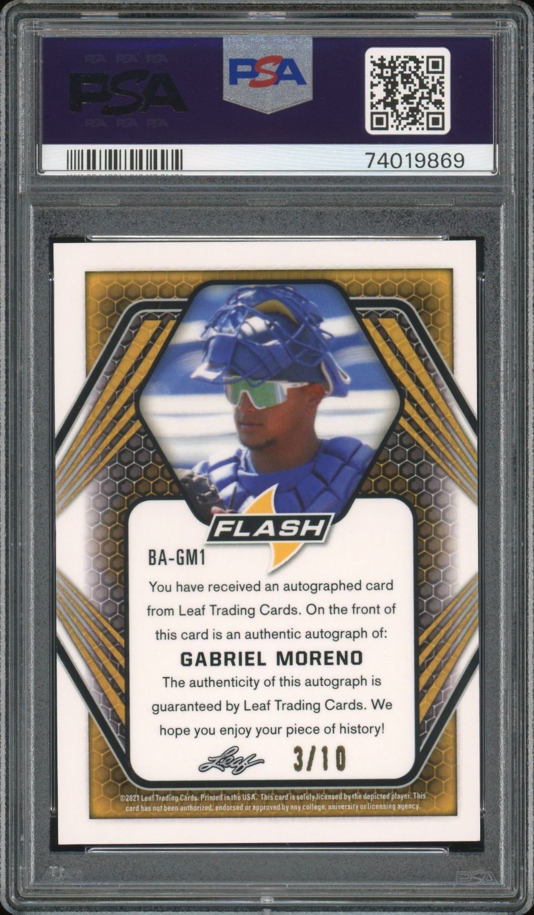Limited edition (of 10) 2021 Leaf Flash autographed rookie card of the young catcher, grading 9 MINT with a 9 Auto by PSA!