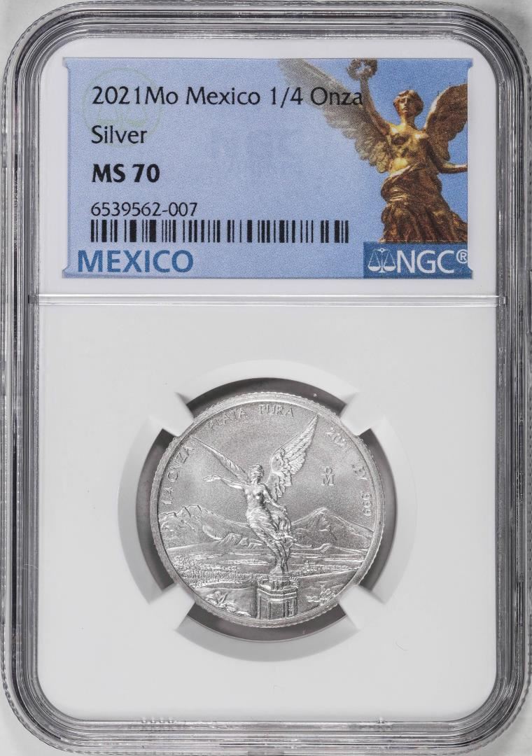One 2021-Mo Mexico 1/4 oz Silver Libertad Coin NGC MS70. NGC Certified.